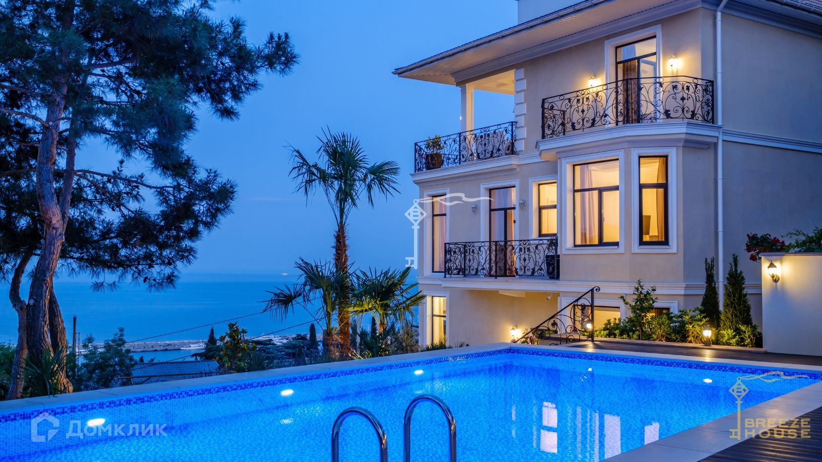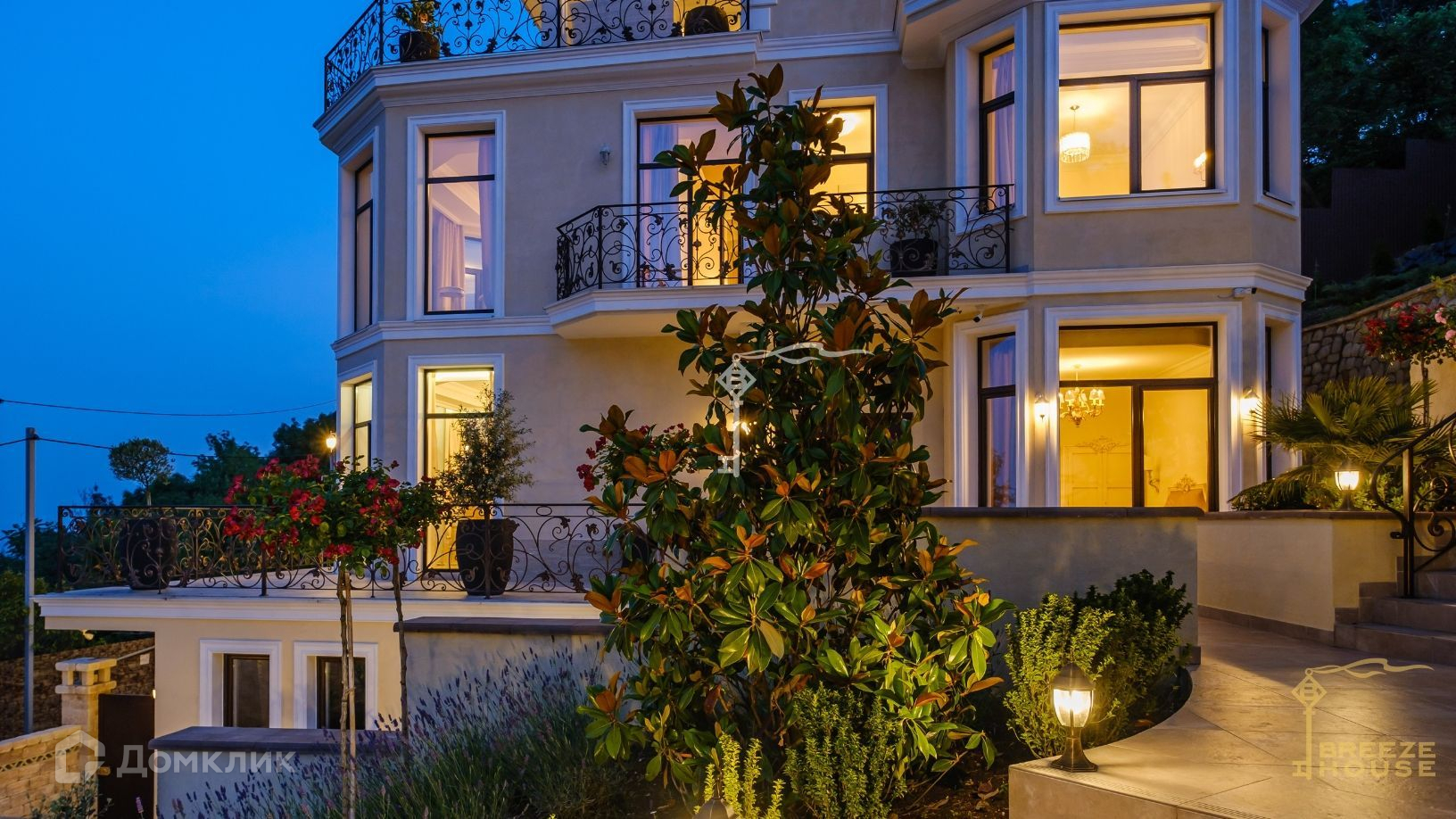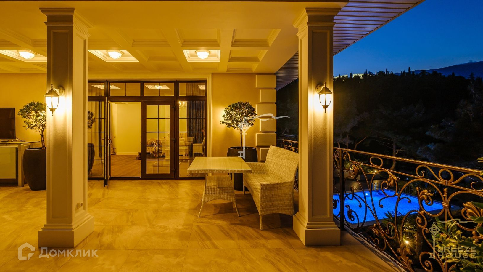 Просторная вилла 585 м² с панорамным остеклением и открытыми обширными террасами с кованными балюстрадами.