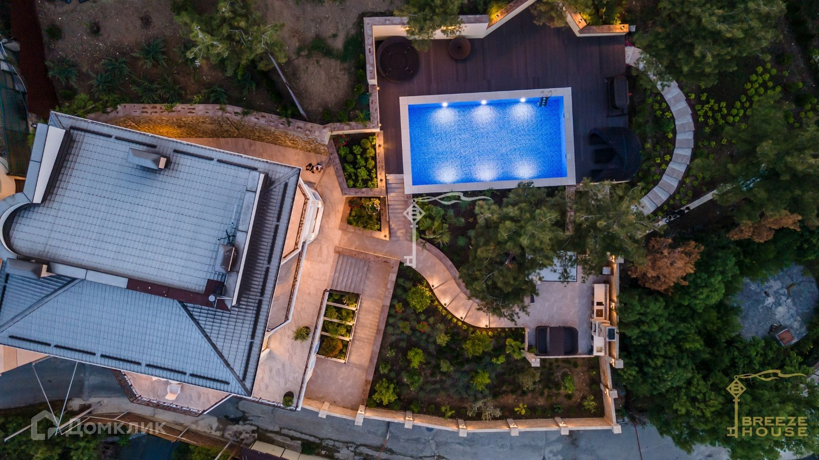 На участке выполнен ландшафтный дизайн, подсветка всей территории, высажены: сосны, магнолии, оливковые деревья, многолетние пальмы, кумкваты, фейхоа, инжир, мушмула, гранат. Установлен система автополива.