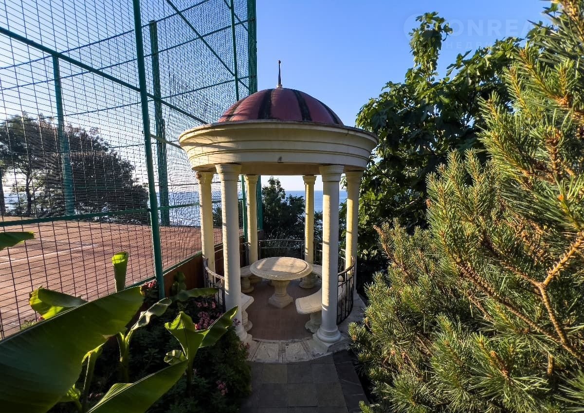 В центре участка расположен теннисный корт, а по периметру установлены уютные беседки для отдыха.