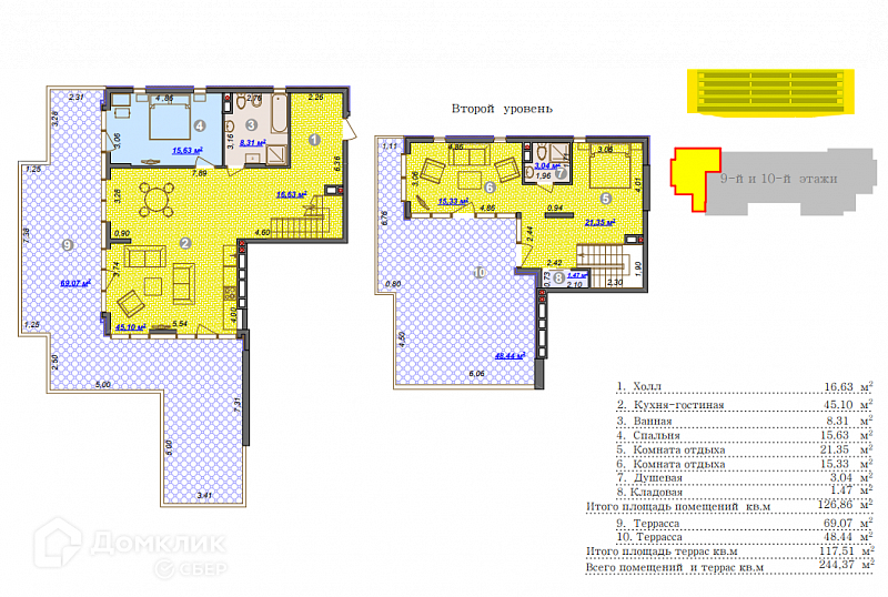 - апартамент - пентхаус, расположенный на 9-10 этажах, общей площадью 257,8 кв.м., в.т.ч 145,5  внутри помещения и 112,3 открытая терраса. Без внутренней отделки, с панорамным видом на море, горы, набережную Ялты.