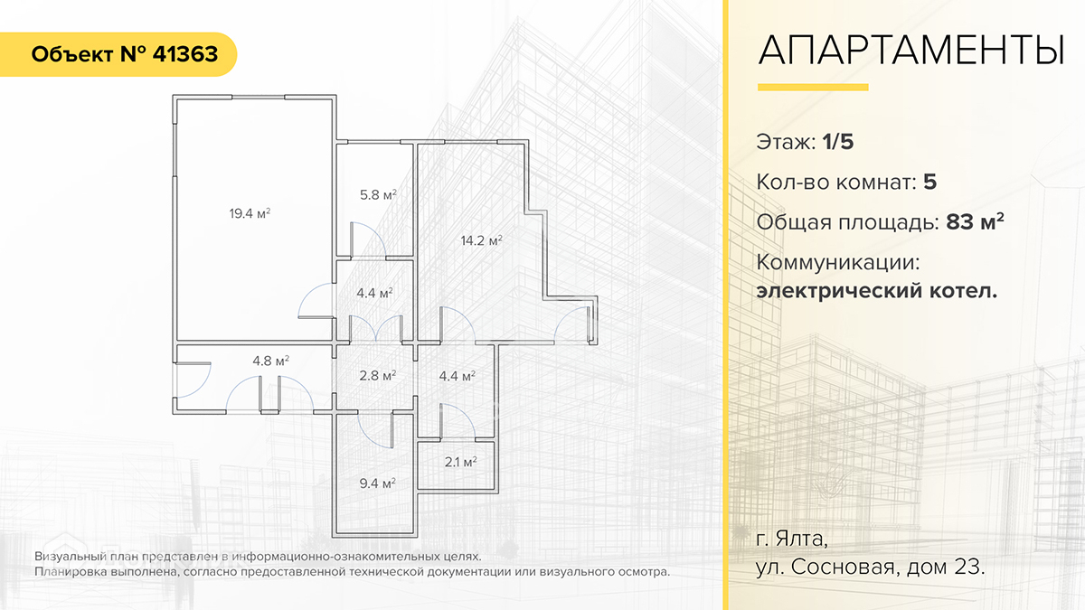Продаются 5-комнатные апартаменты в городе Ялта, улица Сосновая, дом 23. Расположены в жилом доме, на цокольном этаже 5-этажного дома. Апартаменты общей площадью 83 м2. Коридор 2,8 м2, 4,4 м2, 4,4 м2, комнаты 19,4 м2, 5,8 м2, 14,2 м2, 12,4 м2, санузел 2,1 м2, кладовая 9,4 м2 и 8 м2.