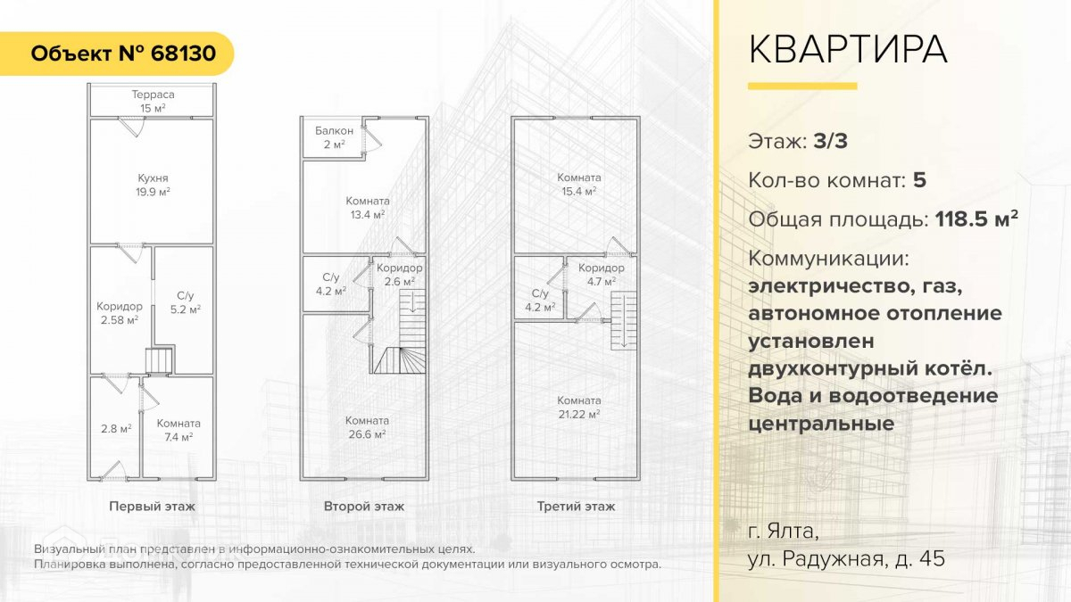 Находятся на 3 этаже 3-этажного дома. Общая площадь 118,5 м2.