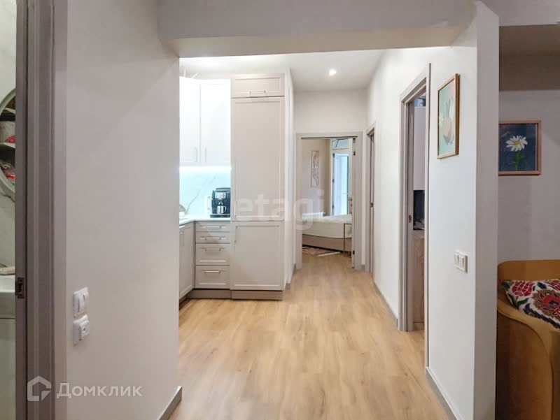 Общая площадь квартиры 82 кв.м. Планировка квартиры предполагает 2 раздельные комнаты, кухонную и обеденную зоны, 3 санузла, гардеробную, прихожую и лоджию. В квартире выполнен современный ремонт, отопление сплит-системы, теплые полы в санузлах. Напольное покрытие - кварцвинил. На кухне встроенная техника - холодильник, посудомоечная машина, духовой шкаф и микроволновка. С лоджии открывается прекрасный вид на облагороженную территорию комплекса и море.