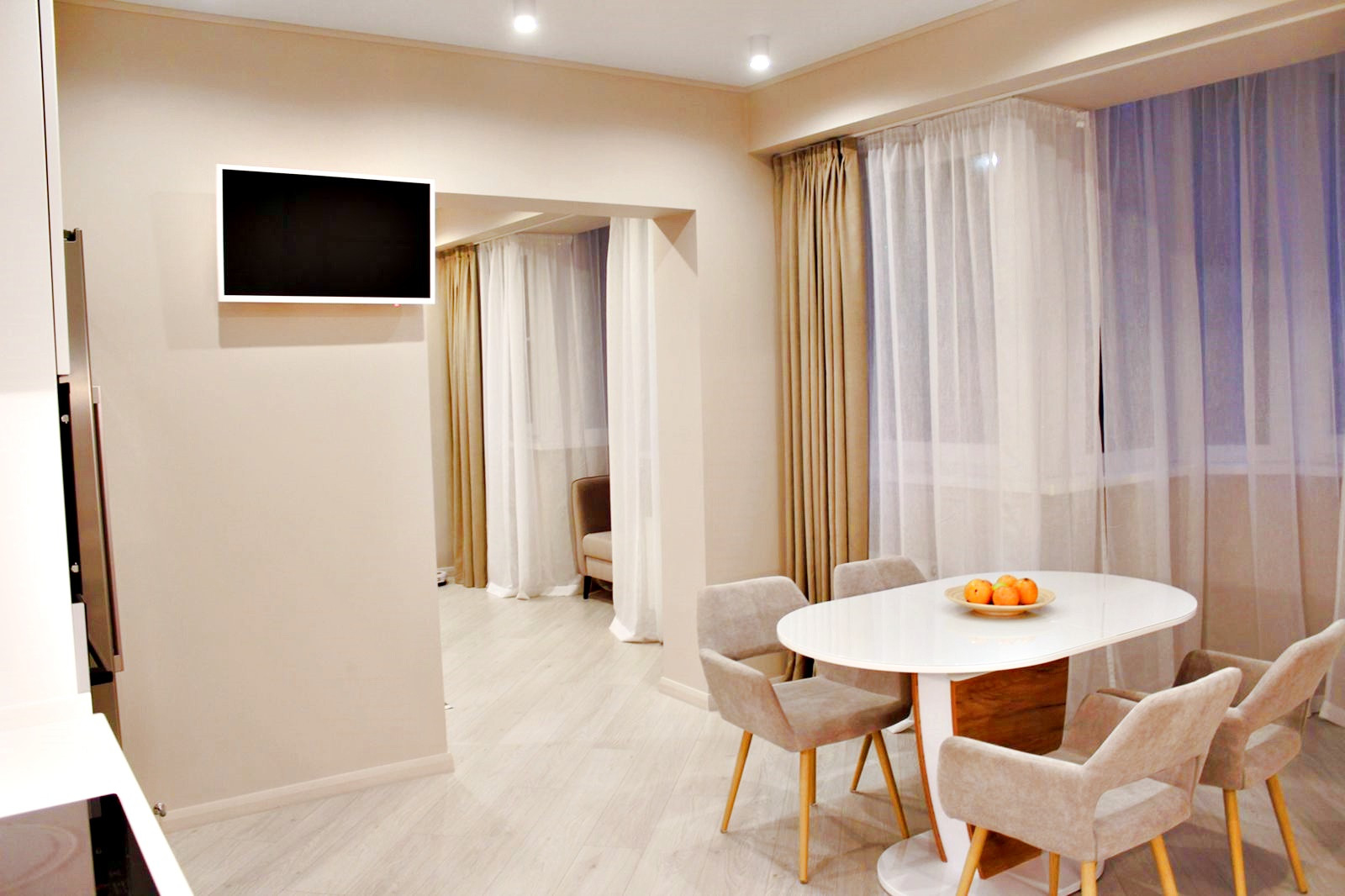 В квартире выполнен дизайнерский ремонт в современном стиле. Квартира полностью укомплектована. Кухня «Мария» с итальянскими фасадами и фурнитурой, бытовая техника Bosch, холодильник Side-by-Side, 2 водонагревателя Electrolux, стиральная машина Bosch, сплит-система, 3 ТВ, европейская сантехника Grohe, Ideal.