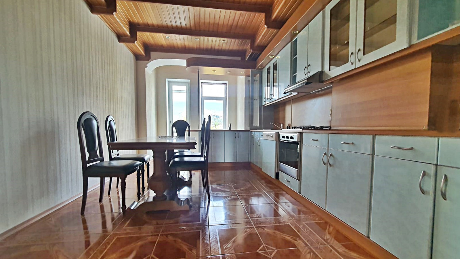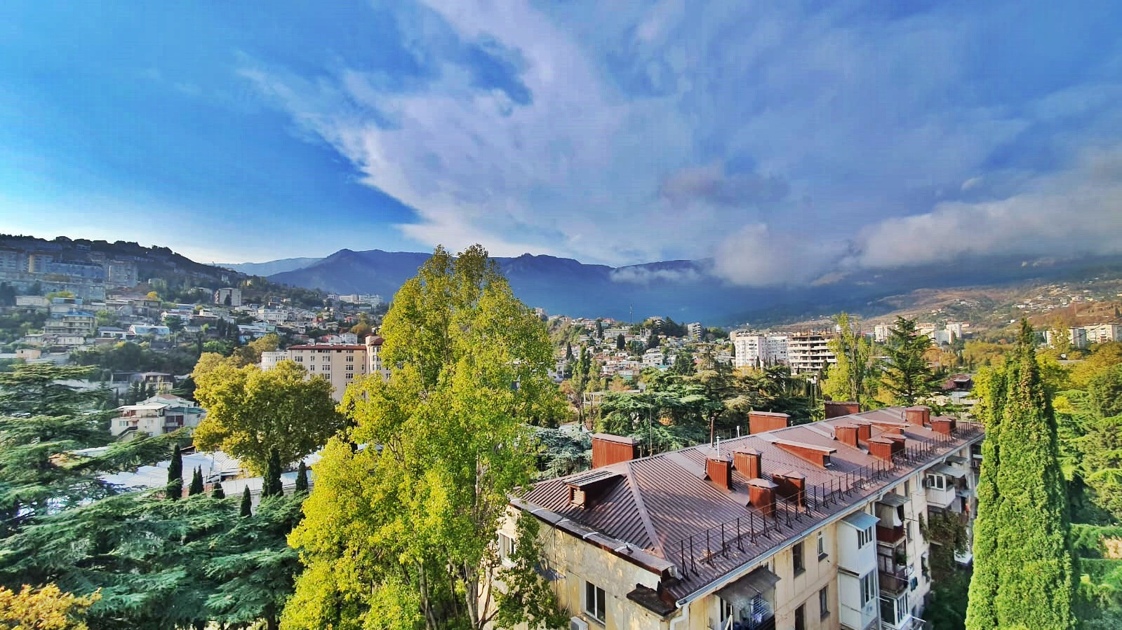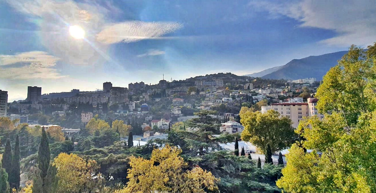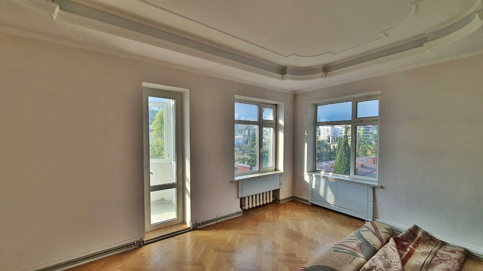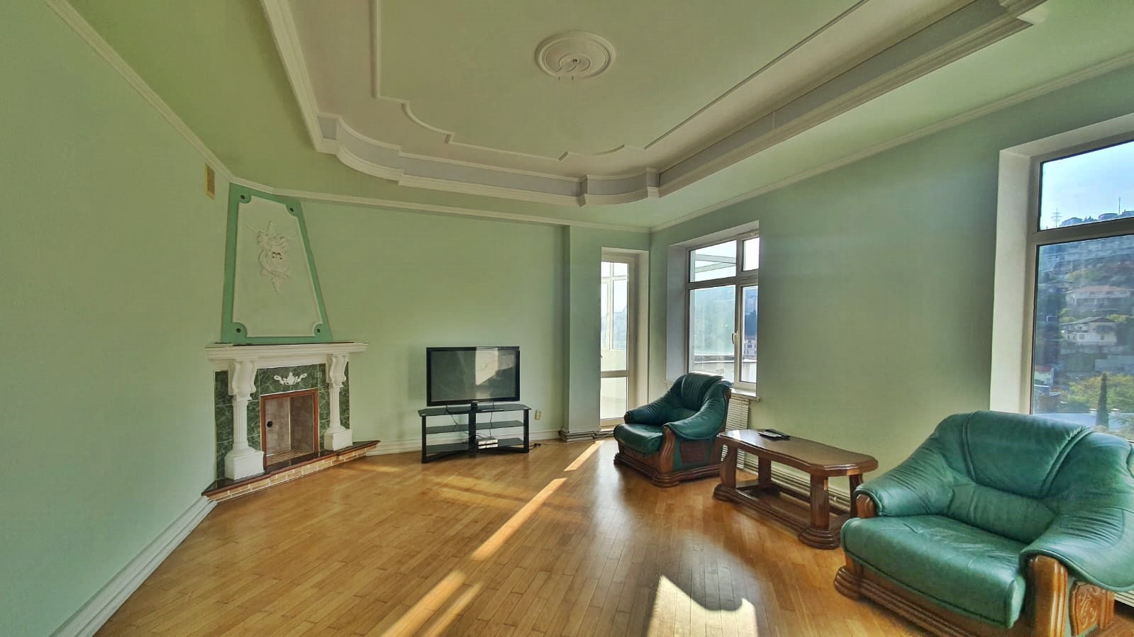 Просторные комнаты, высокие потолки, окна из комнат выходят на три стороны, вид на горы, море и инфраструктуру Ялты.