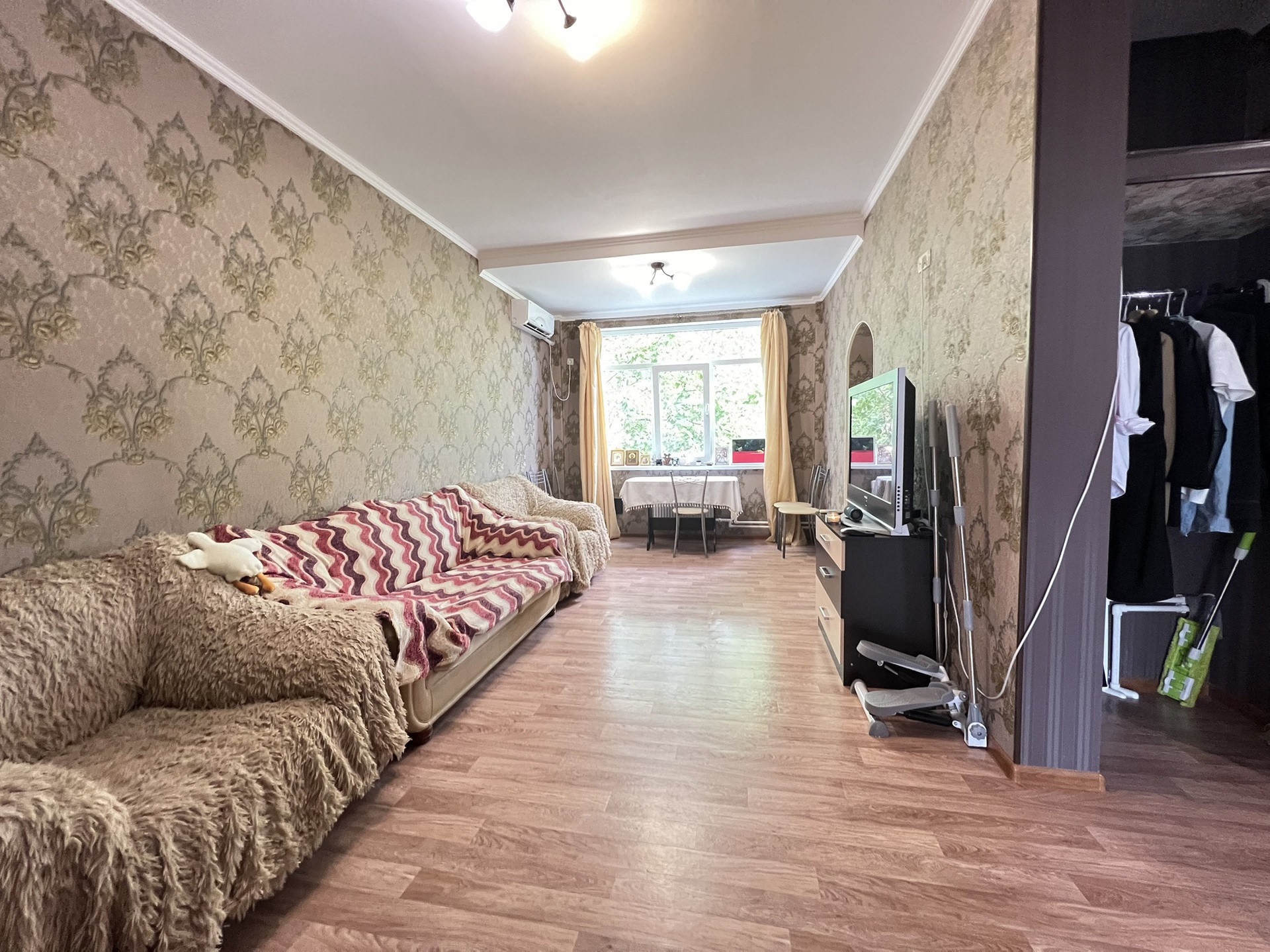Квартира имеет продуманную планировку: жилая площадь составляет 42 квадратных метра, а кухня — целых 28 квадратных метров, что позволяет комфортно разместиться всей семье и гостям. Высокие потолки добавляют пространству воздуха и света. Евроремонт выполнен с использованием качественных материалов, благодаря чему интерьер выглядит свежим и современным. Санузел совмещённый, что является удобным решением для экономии пространства.