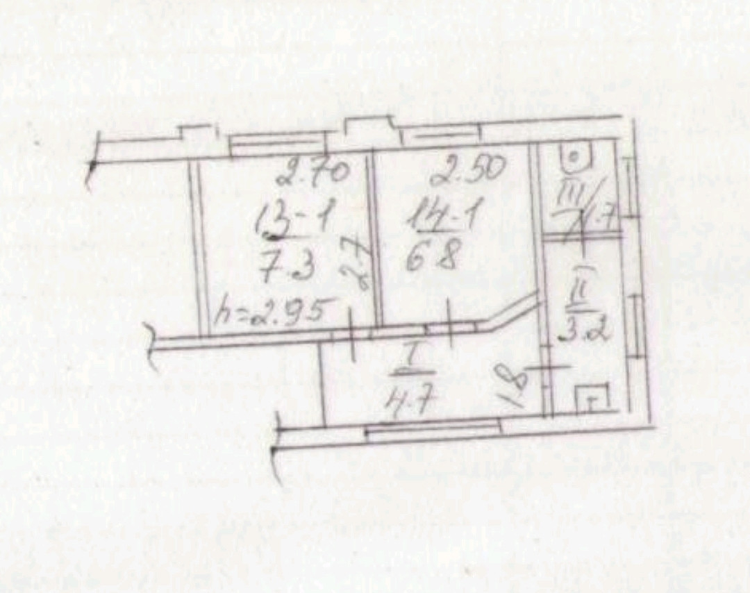 Две раздельные, жилыe комнaты 7,3 и 6,8 кв.м., куxня 4,7 кв.м. нaходится в коридорe, cанузел 4,9 кв.м. совмeщён.