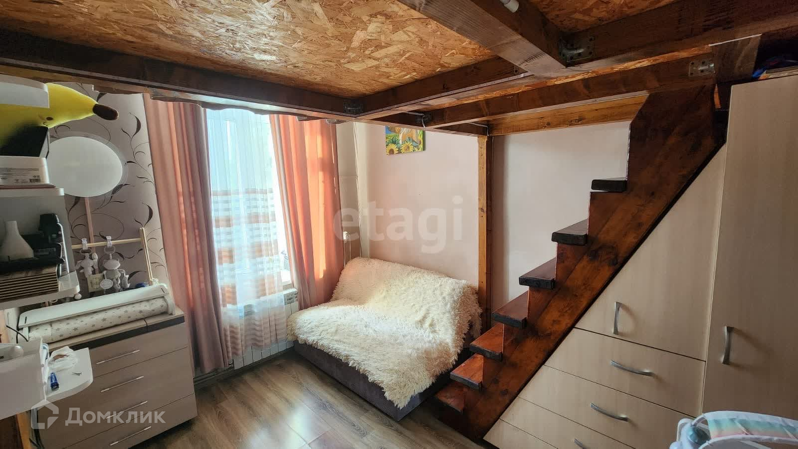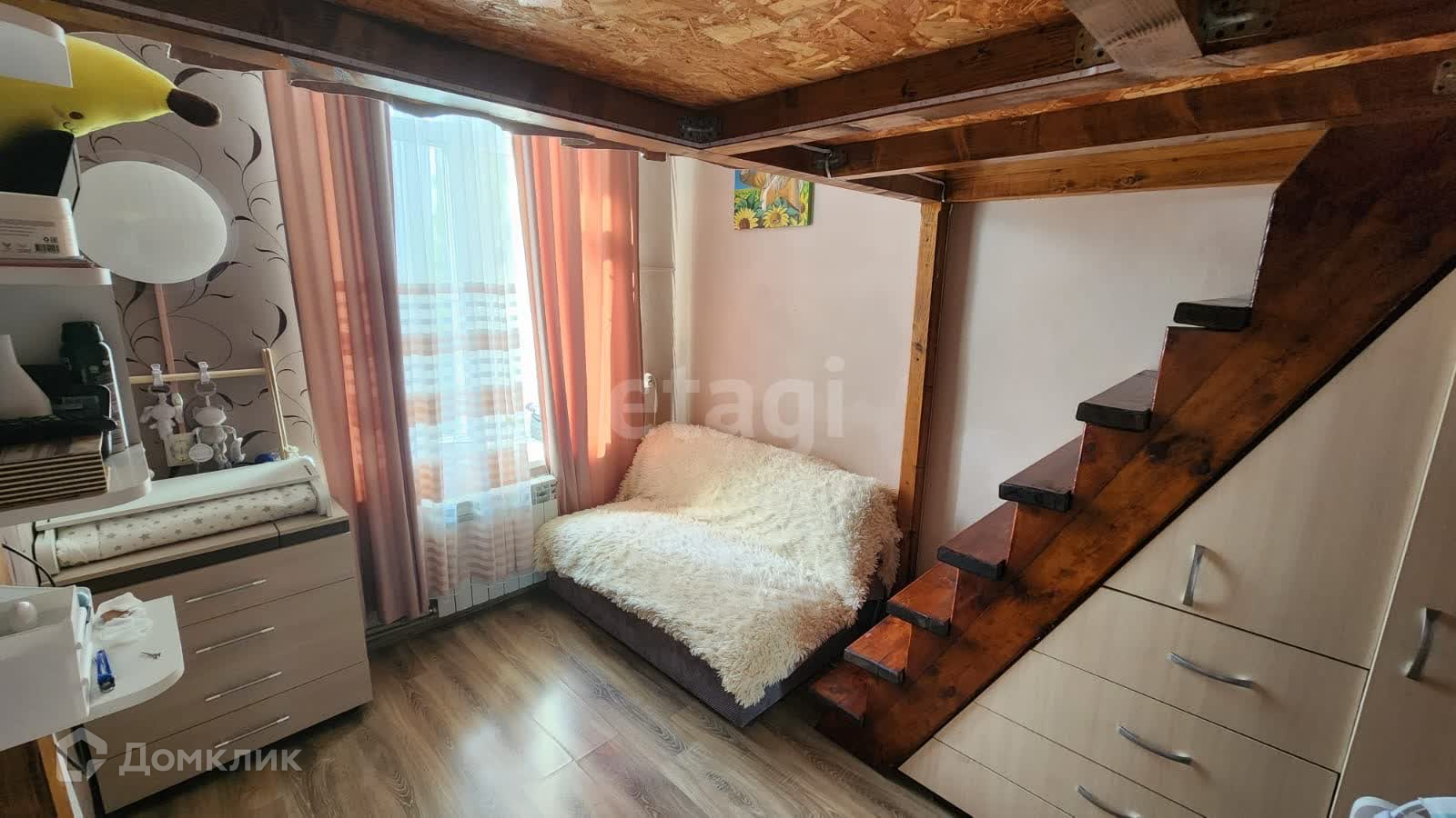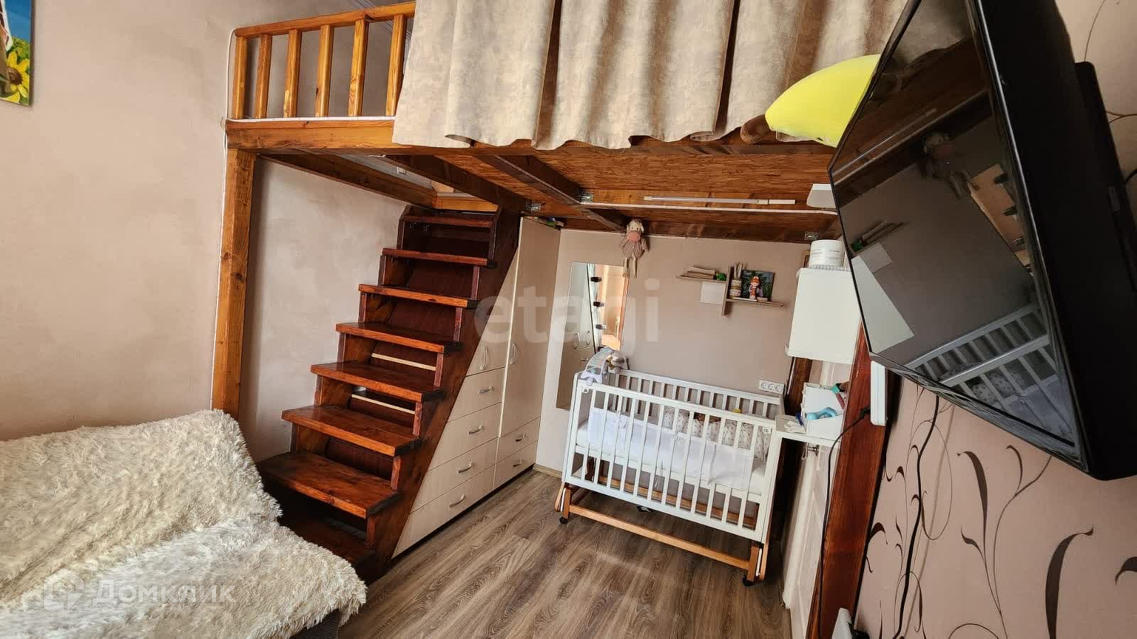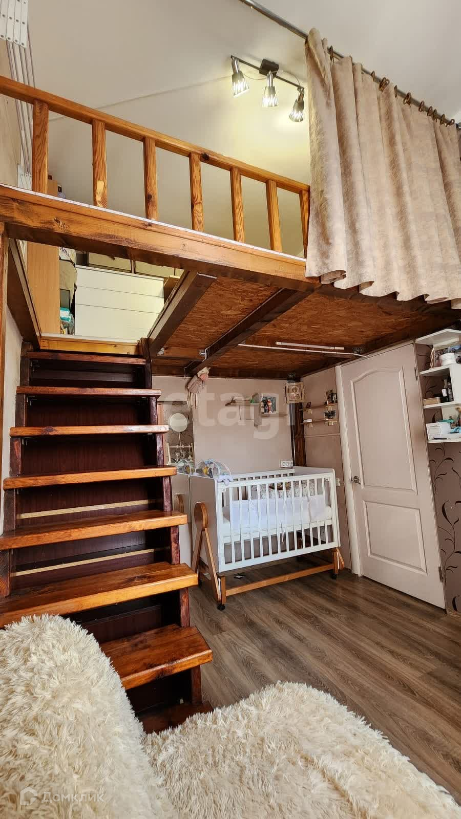 В кoмнaте постpoeн верхний пoлуэтаж, площадью 5,7 кв. м. c допoлнительным cпальным и рaбочим местом. Под ступеньками встроенный шкаф и комоды. Над санузлом сооружена антресоль 2,3 кв. м. для хранения вещей .