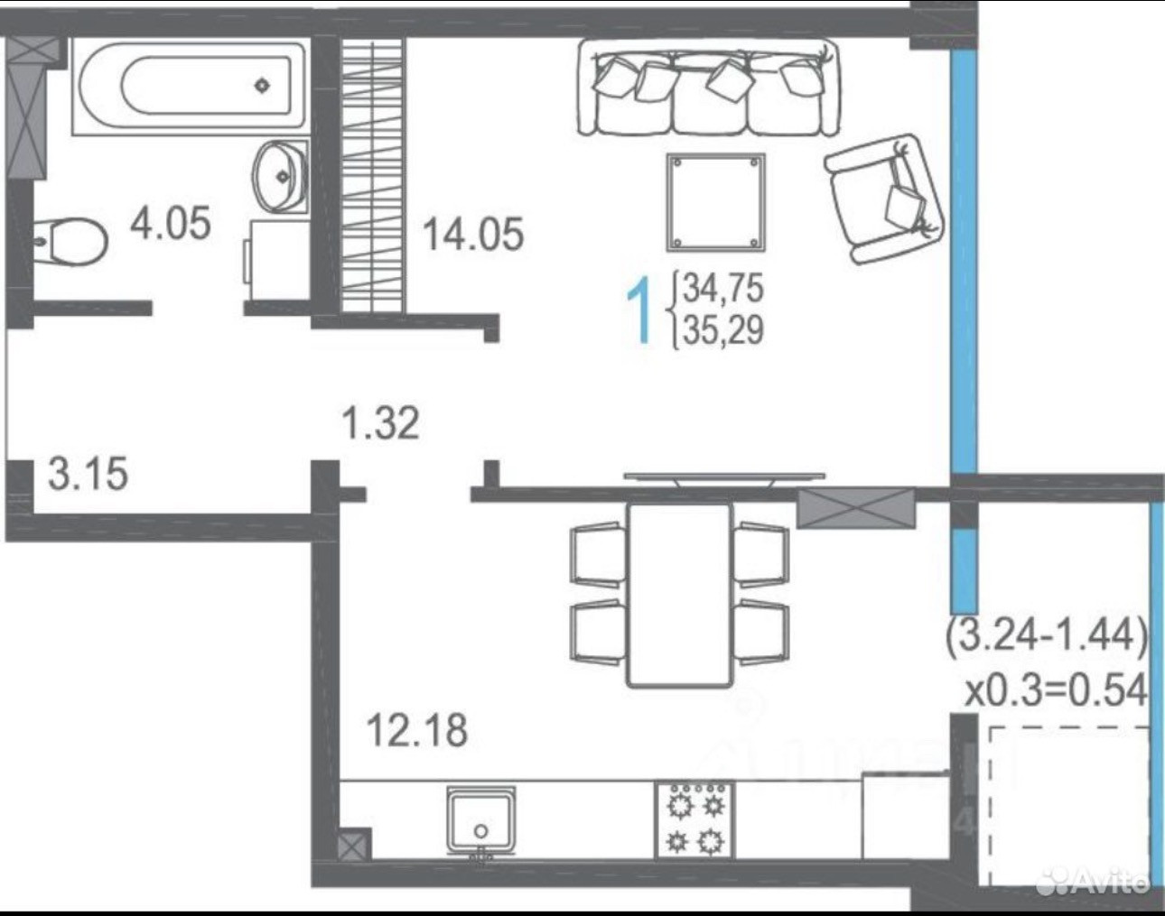 Общая площадь 35.3 м2