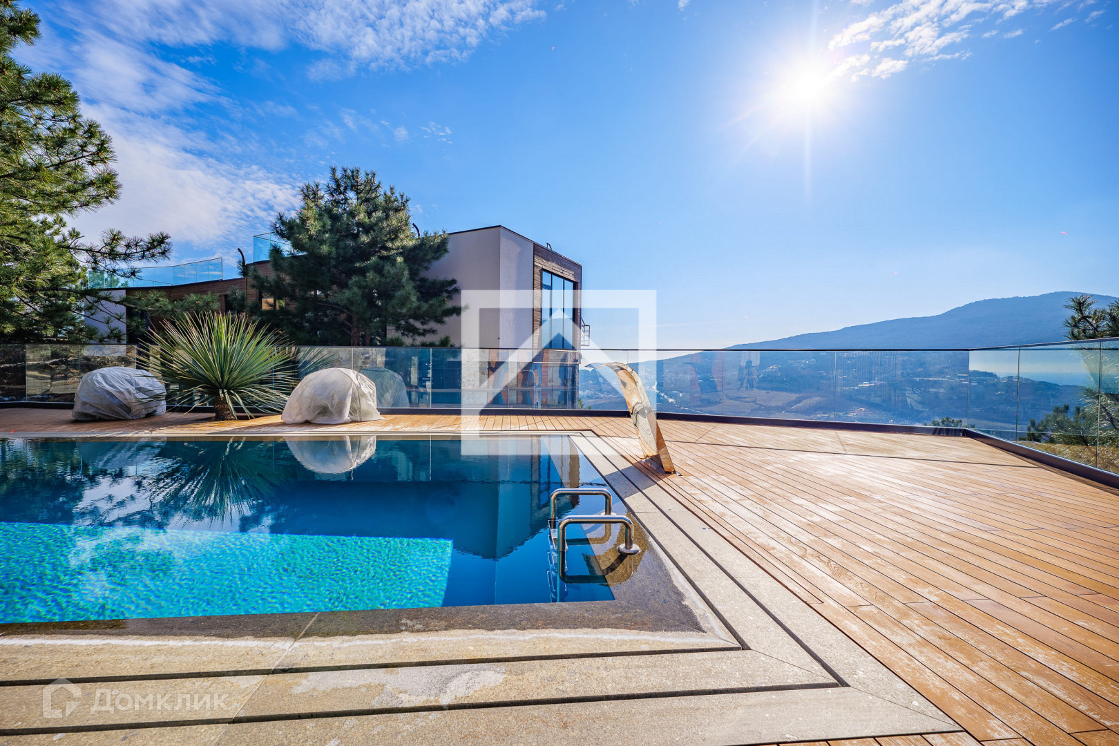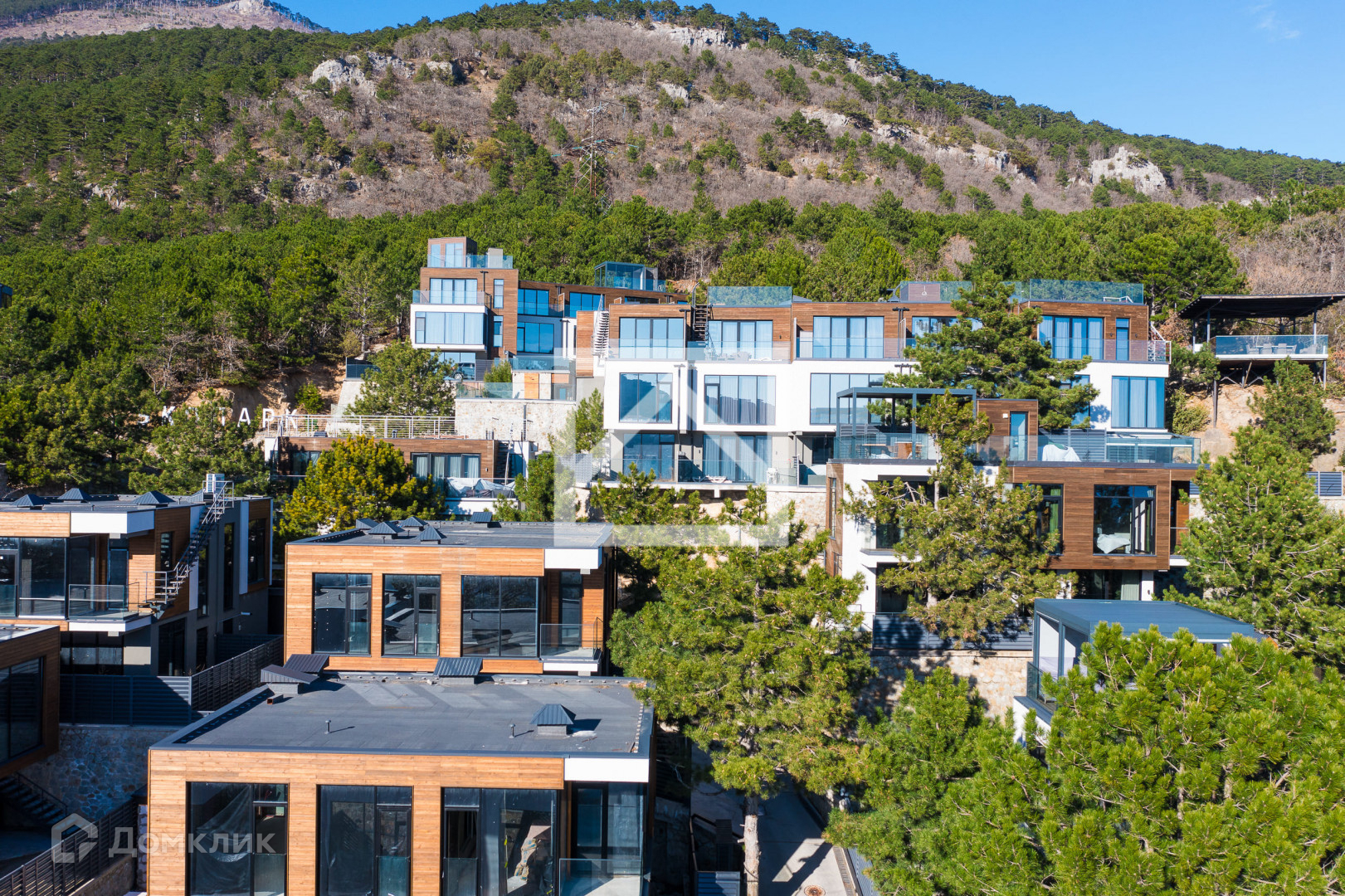 Дуплекс свободной планировки находится в нижней части посёлка, самый первый от въезда. За счет того, что коттедж крайний, он имеет один из самых больших участков и позволяет разместить бассейн или беседку. С южной стороны ничего не помешает панорамному обзору на море и Ялту. Со 2 этажа просматриваются горы, море и панорама города.
