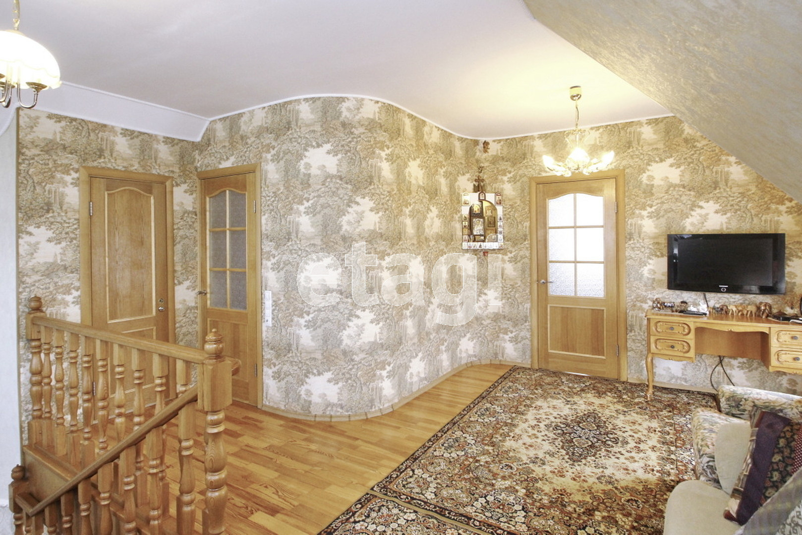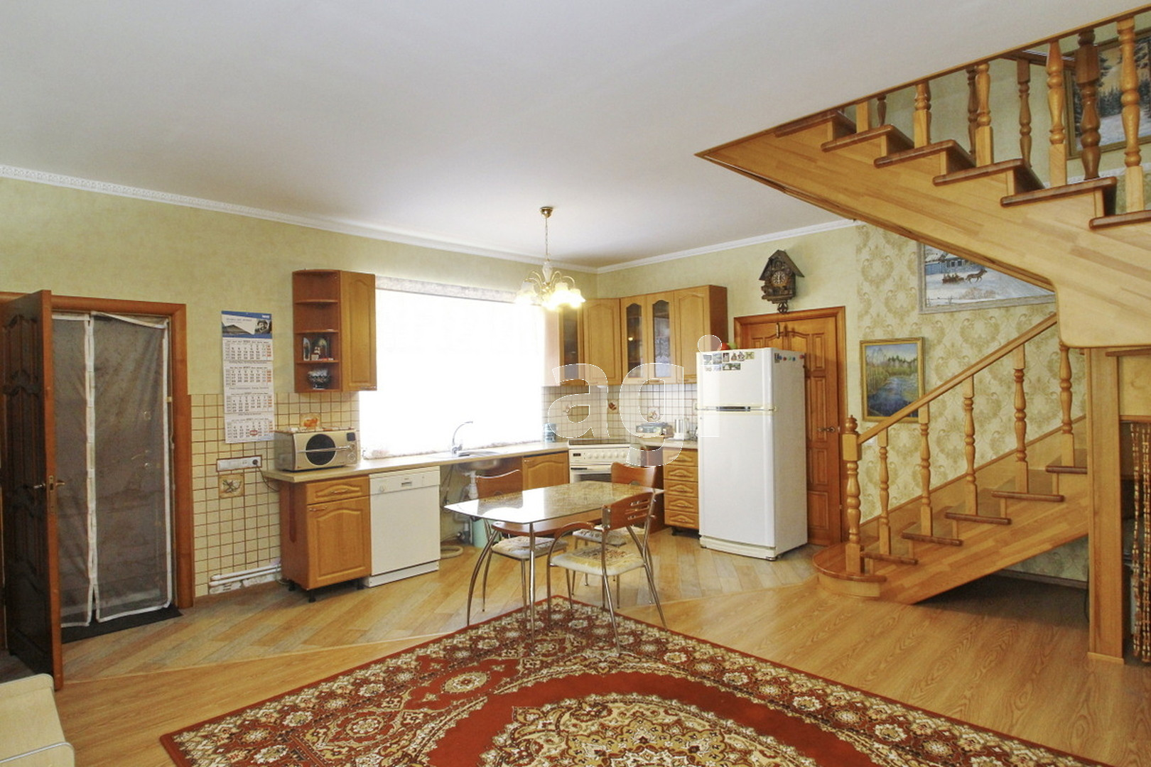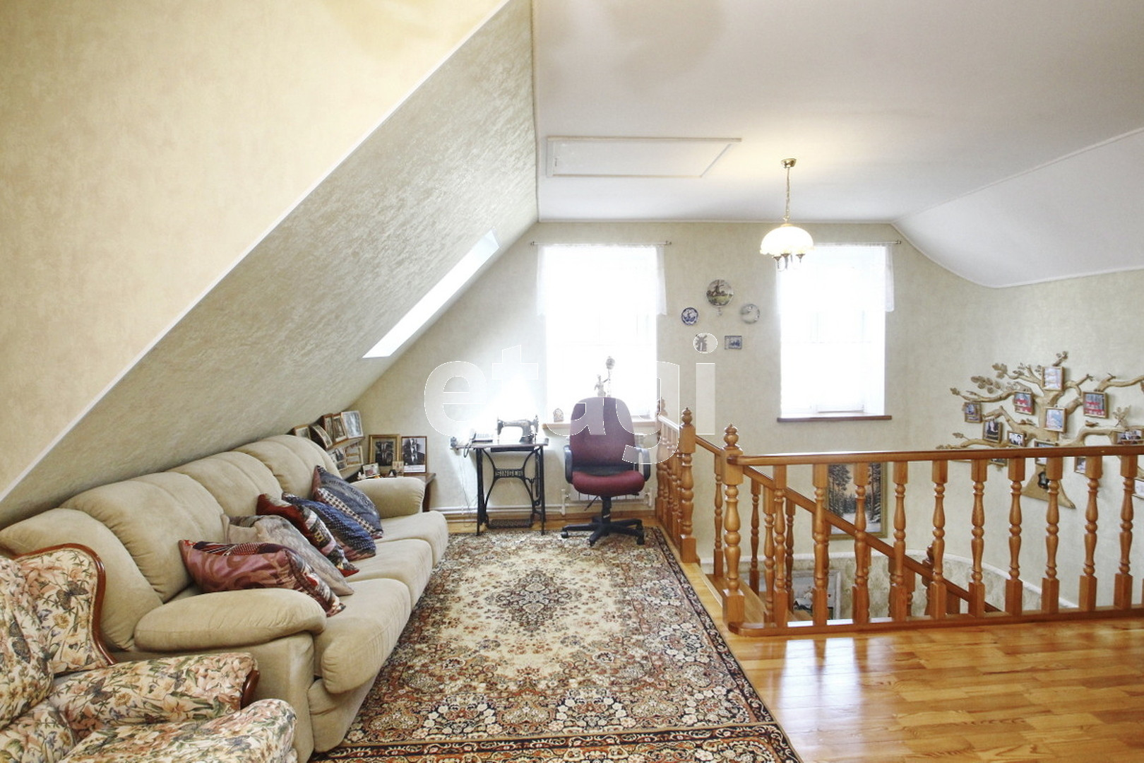 На первом этаже просторная гостиница и кухня совмещенный санузел с душевой кабиной. Выполнен косметический ремонт в классическом стиле. На мансардный этаж ведет надежная деревянная лестница, выполненная под заказ. На мансардном этаже расположено две спальни, а также санузел. В доме газовое отопление, центральный водопровод и канализация.