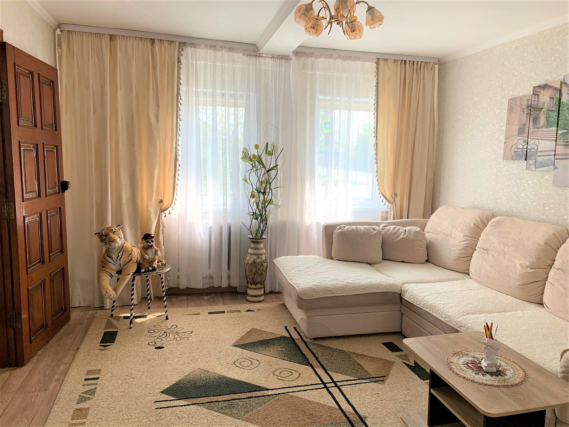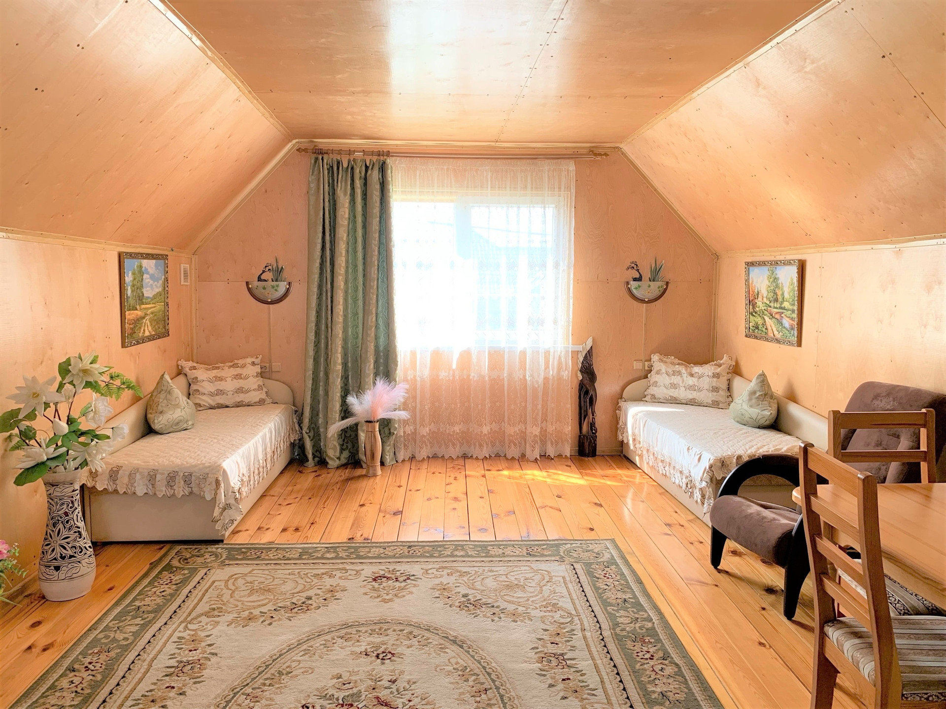 На первом этаже просторная и светлая гостиная, две спальни и кухня.