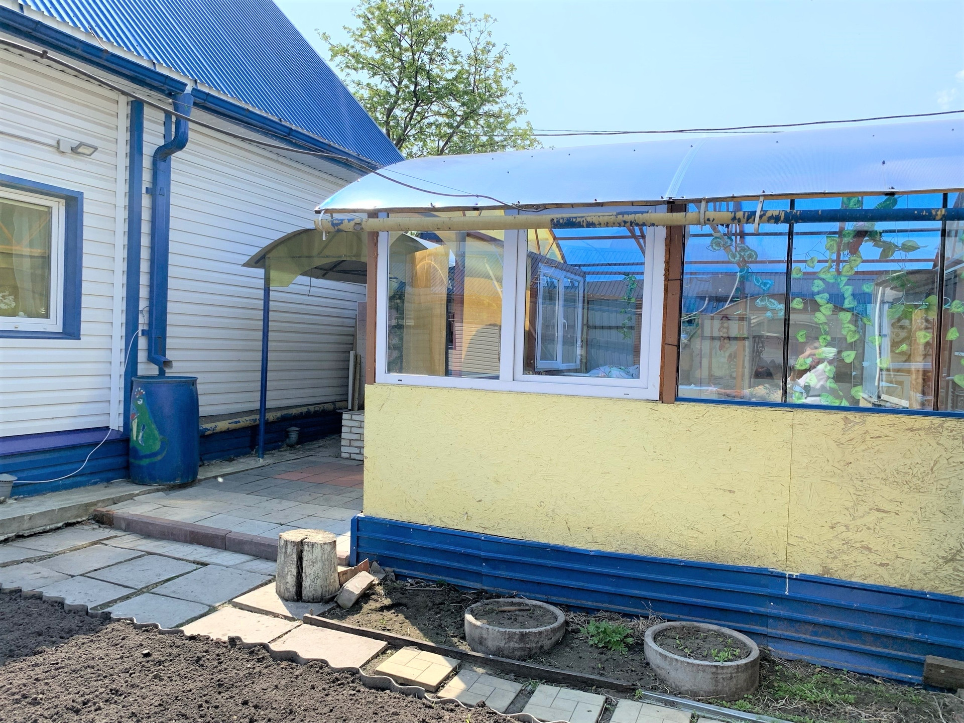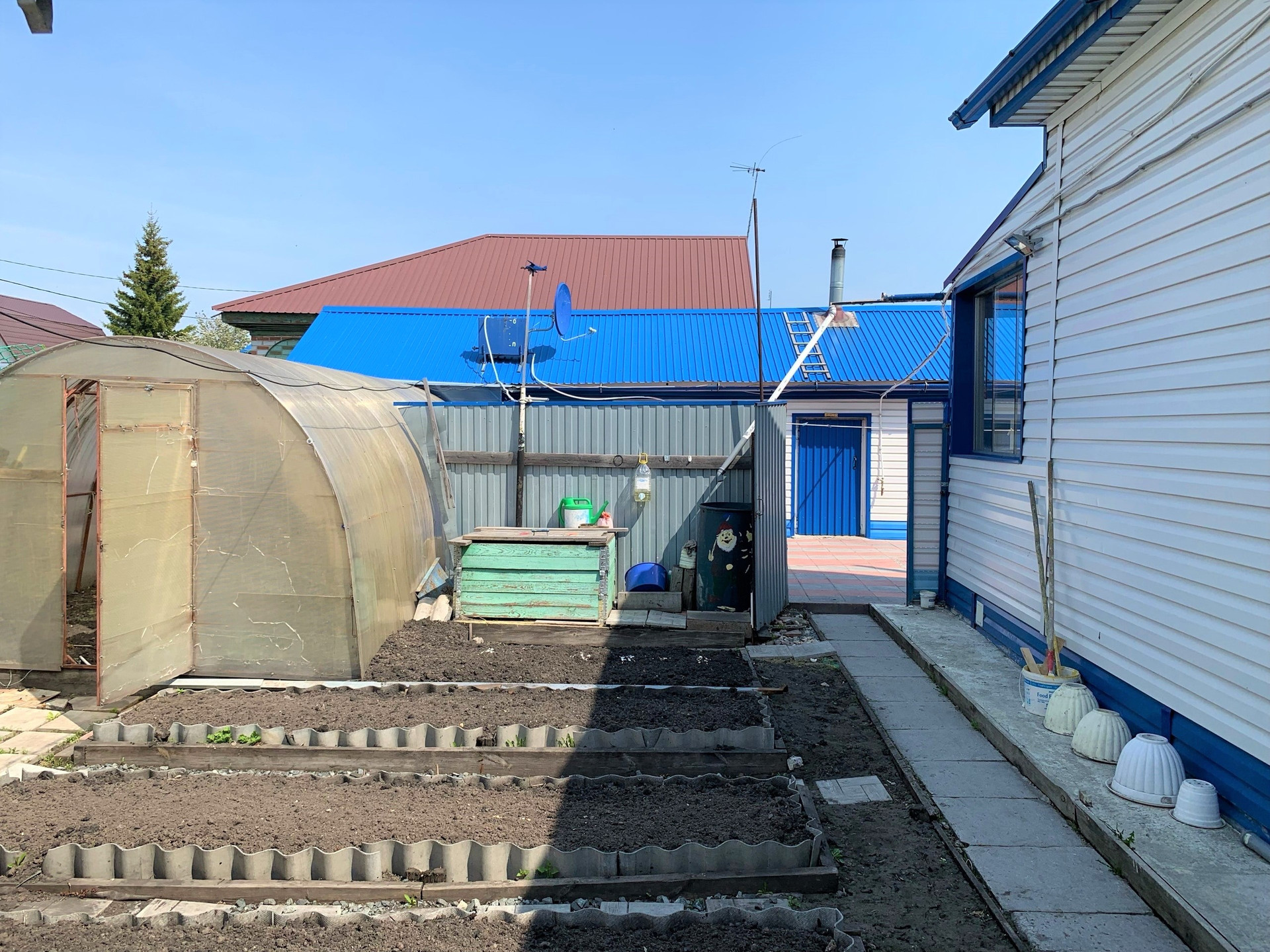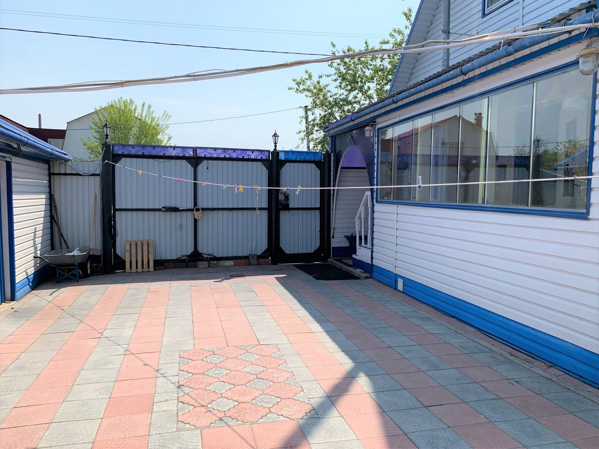 Во дворе покрытие брусчатка, есть капитальный гараж,  баня и сарай для хранения дров и инвентаря. Также на участке есть большая теплица и все насаждения.