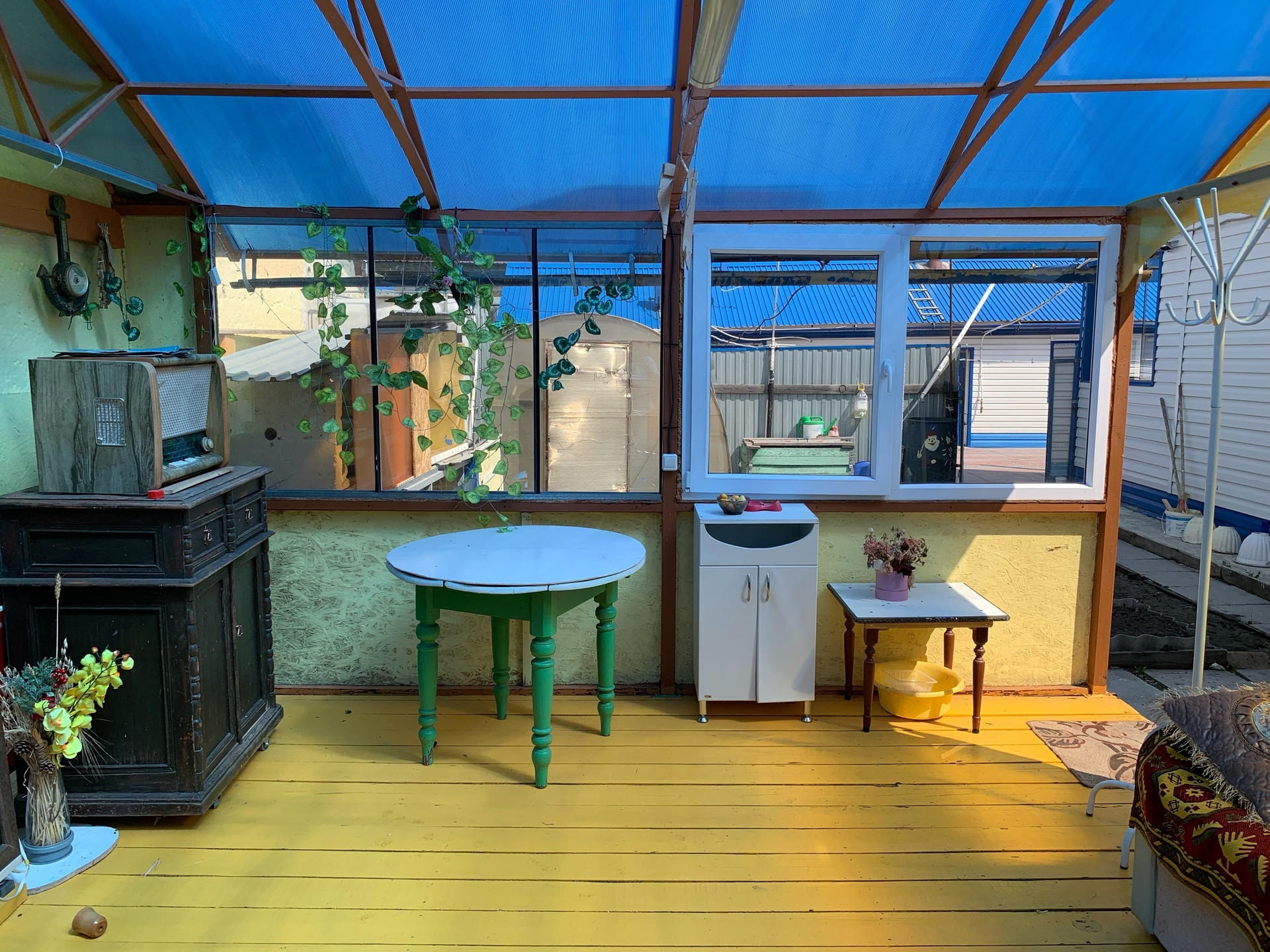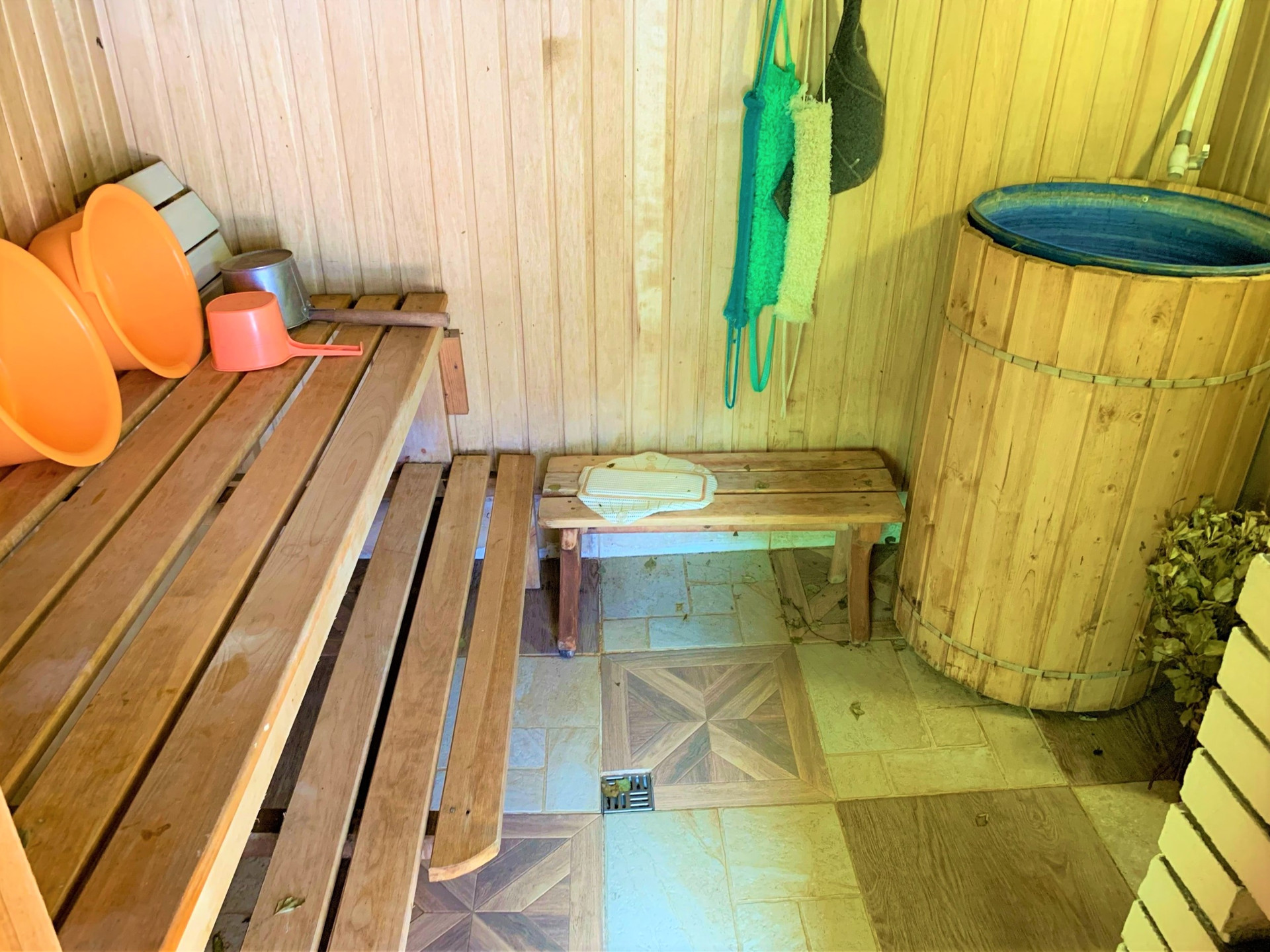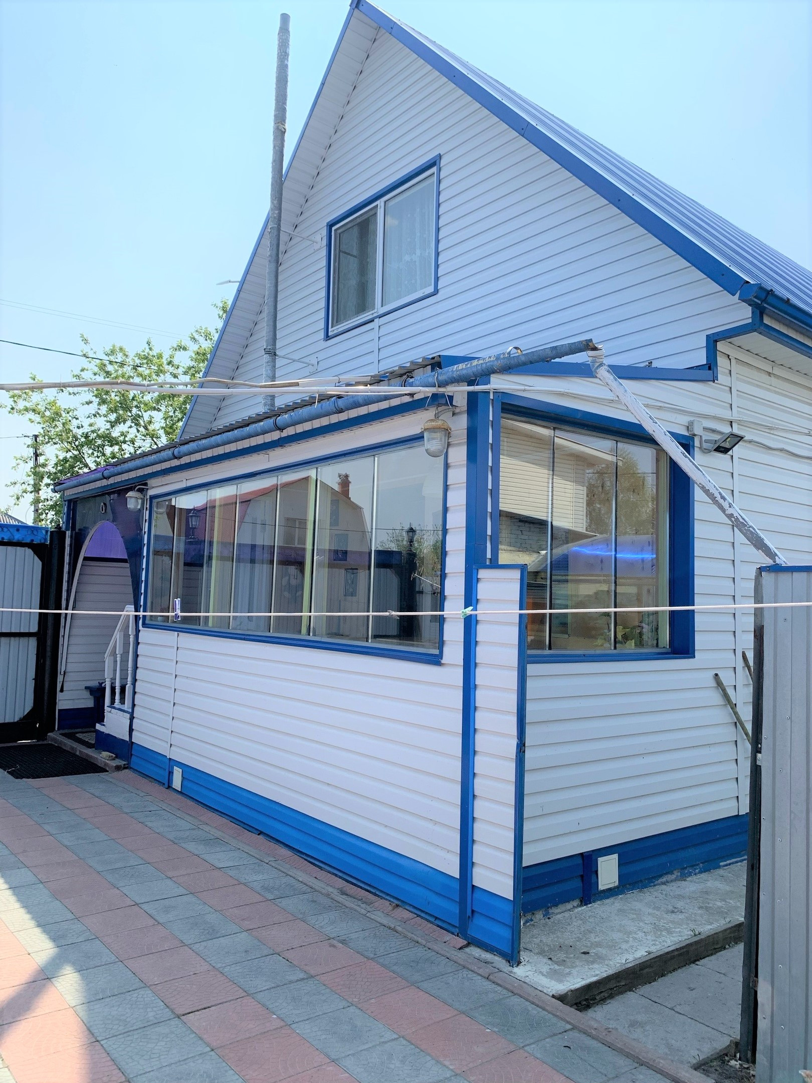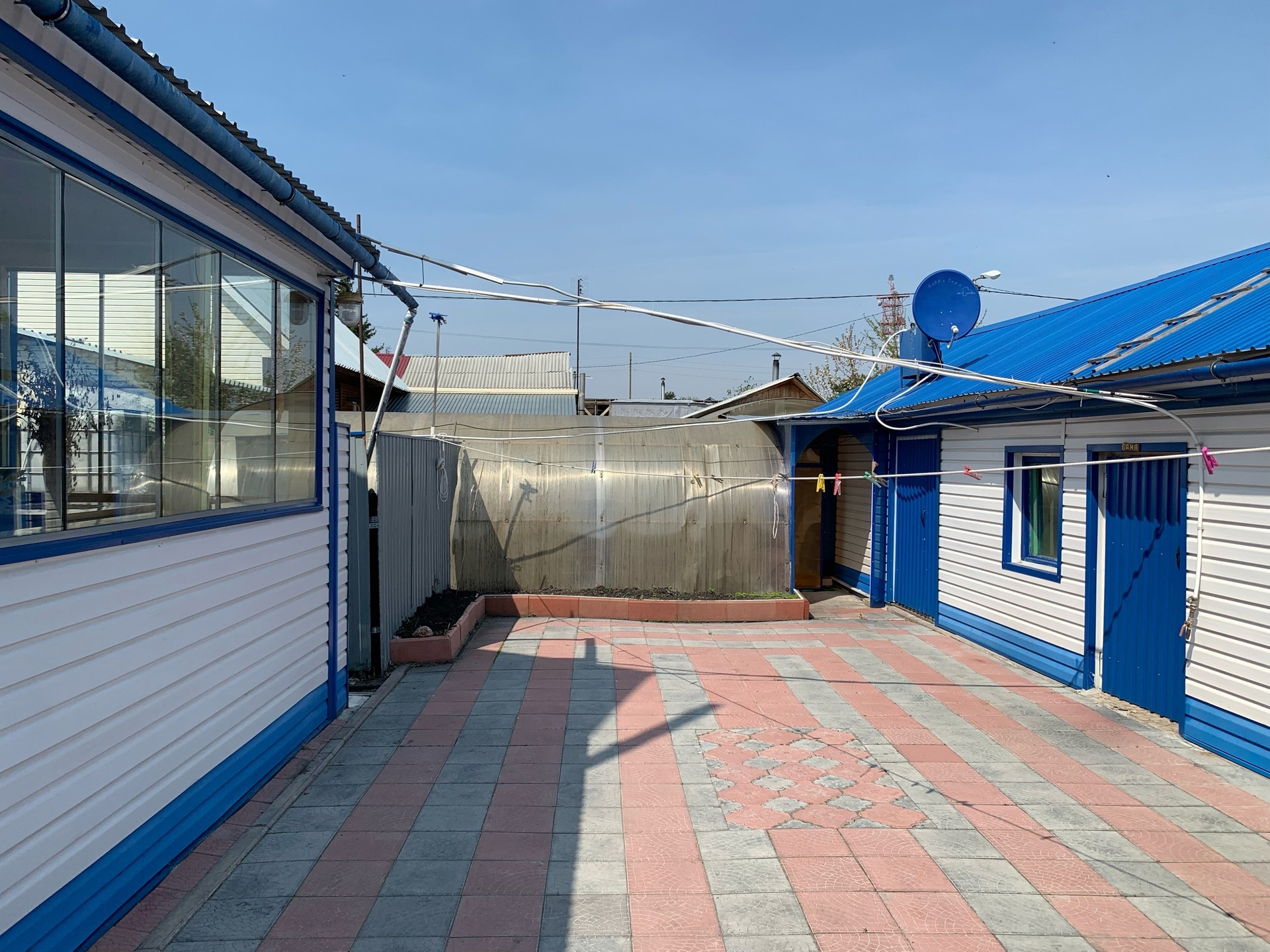 Во дворе покрытие брусчатка, есть капитальный гараж,  баня и сарай для хранения дров и инвентаря. Также на участке есть большая теплица и все насаждения.