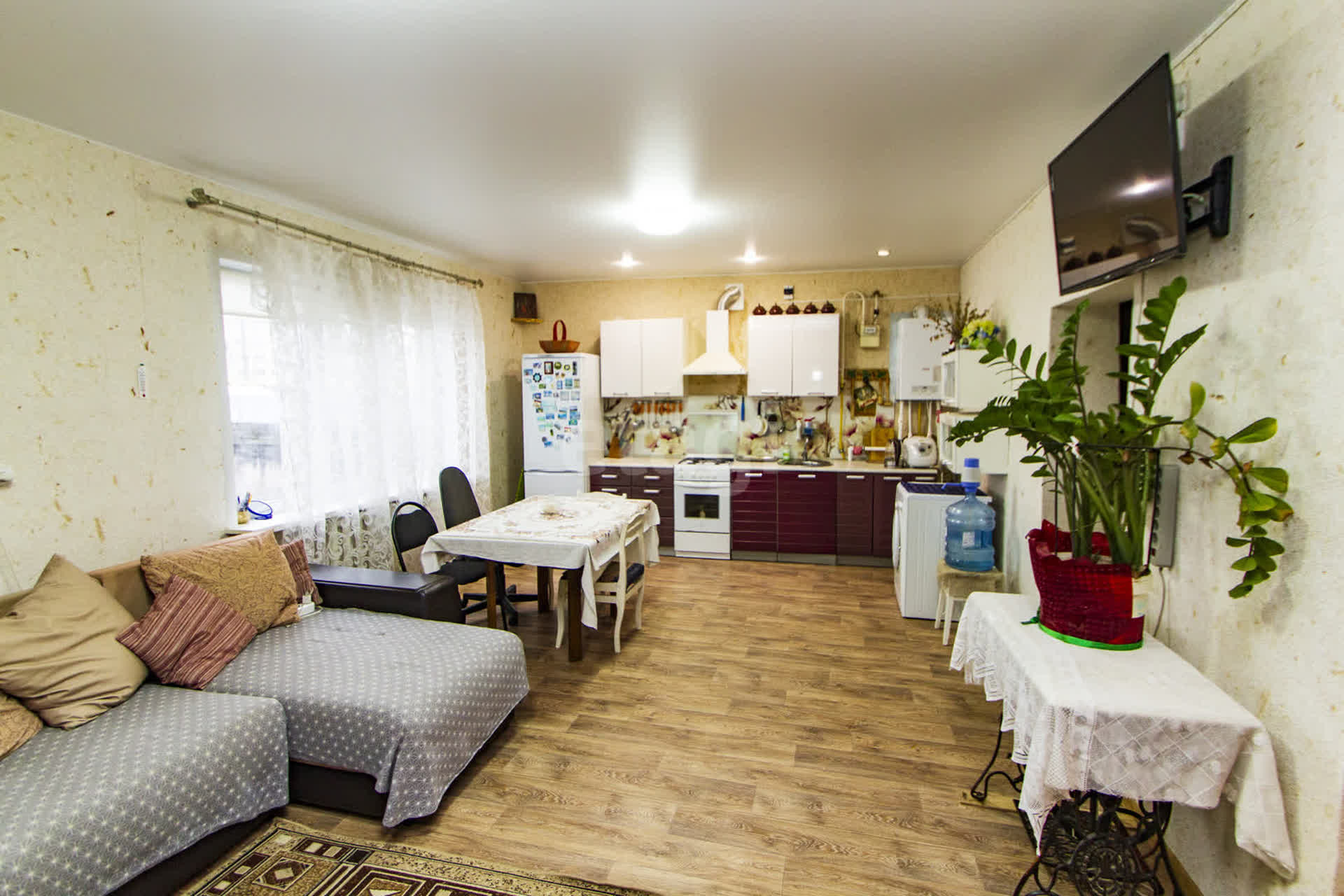 Представлен на продажу благоустроенный, хороший дом площадью 125 кв.м. (три комнаты, кухня-гостиная), земельный участок 6,4 сотки. Дом построен из бруса, окна пластиковые, ремонт сделан косметический. На участке есть насаждения - вишня, яблоня и другие деревья. Есть баня, помещение для хоз. нужд и гараж на две машины. подъезд к дому обеспечивается асфальтированной дорогой. Рядом с домом есть магазины, поликлиника, школа и автобусная остановка. Проведен интернет и телевидение.