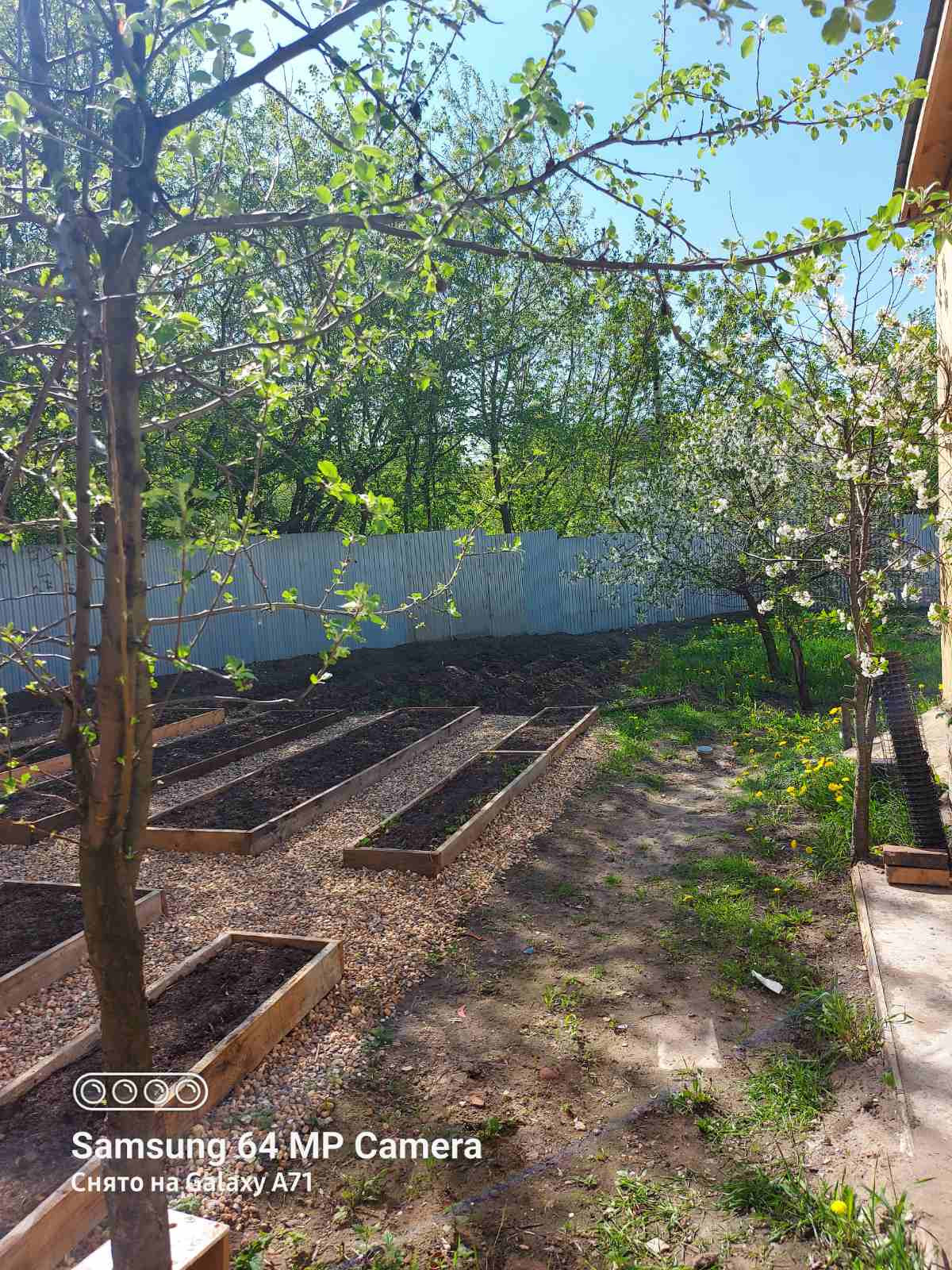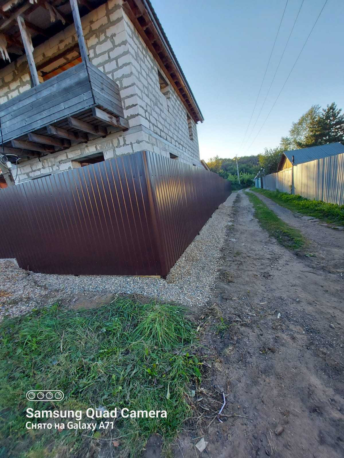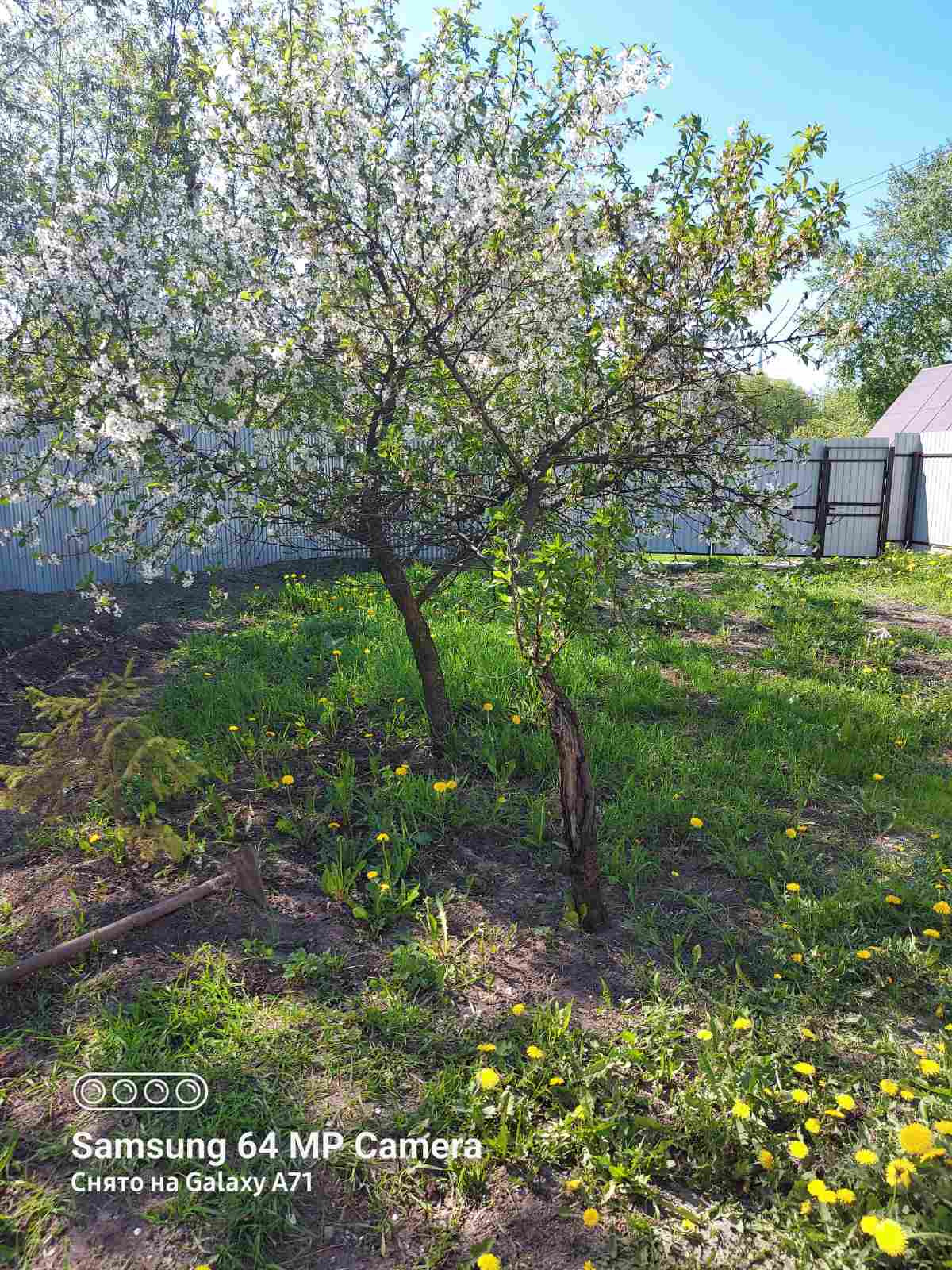 Территория огорожена забором из профлиста. Есть ворота и калитка. Участок разработан, имеются плодовые насаждения - яблони, слива, вишня, кусты смородины.