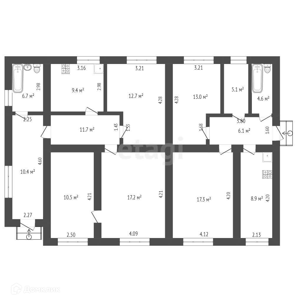 В каждой квартире: по две комнаты, гардеробная-кладовка, кухня, ванна с сан.узлом, подвал для хранения домашних заготовок и чердак.