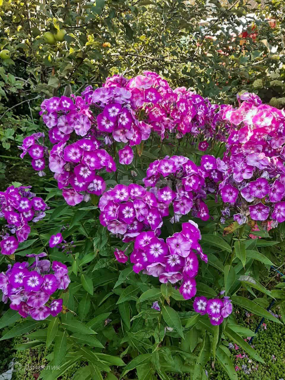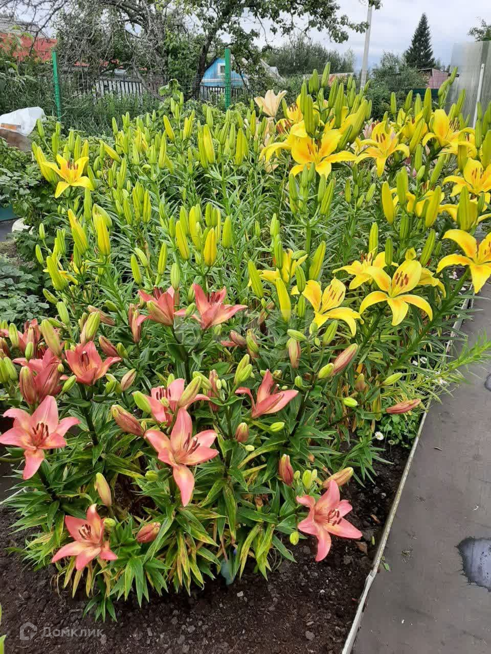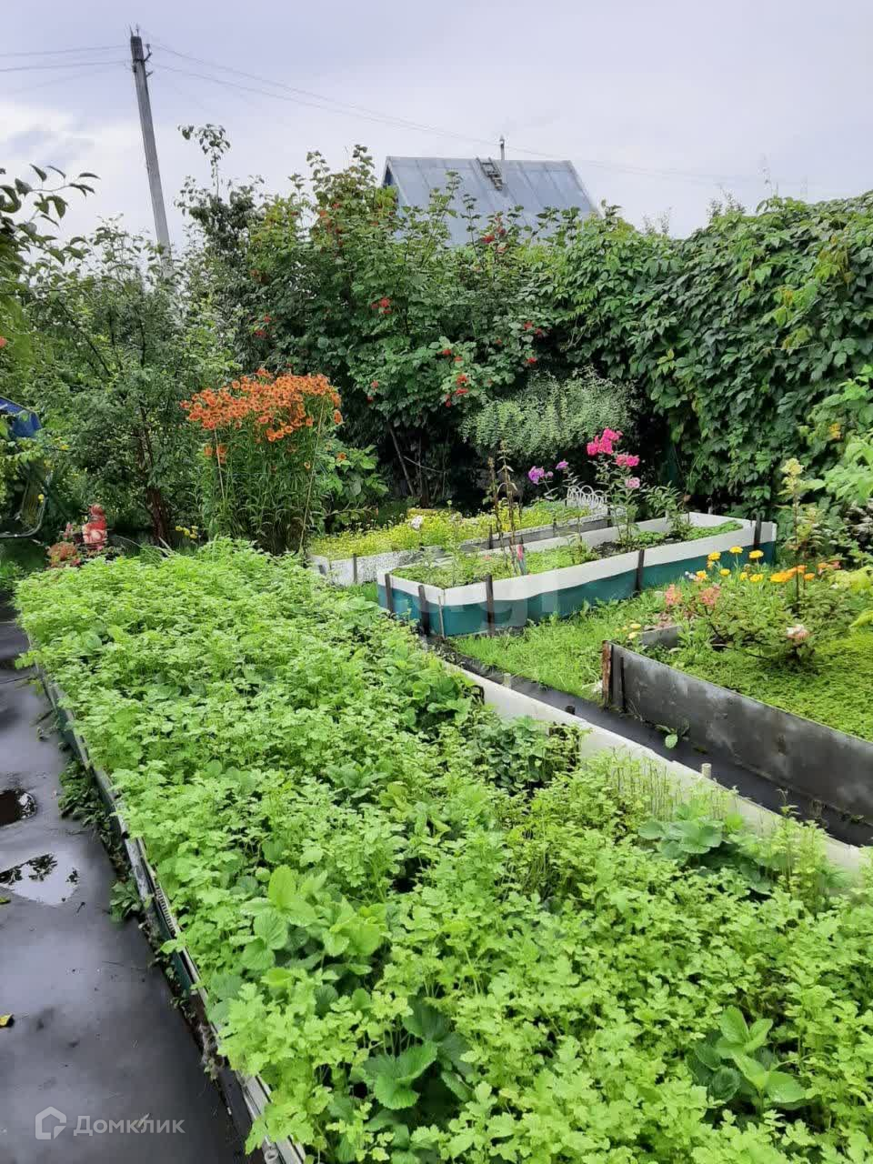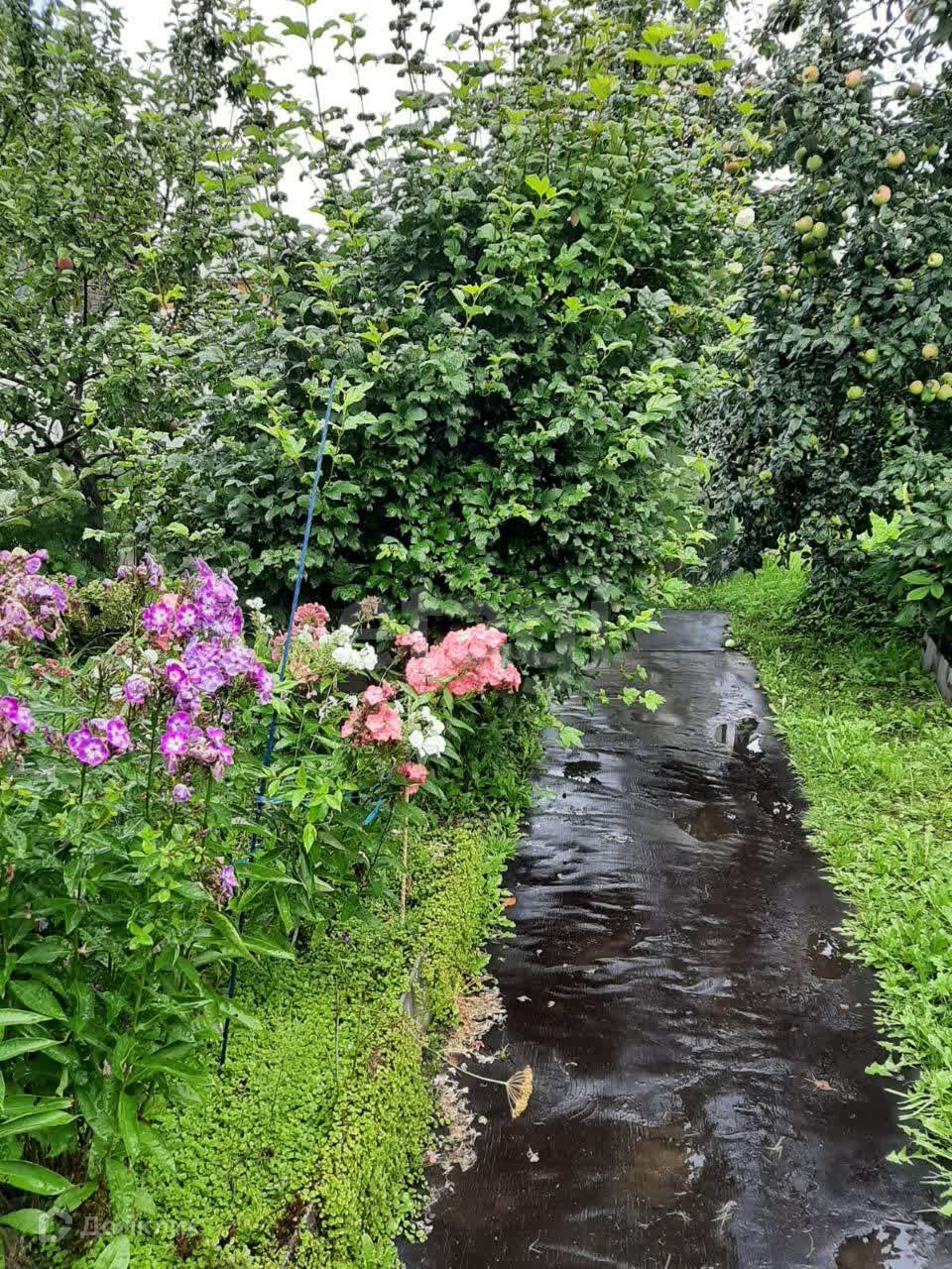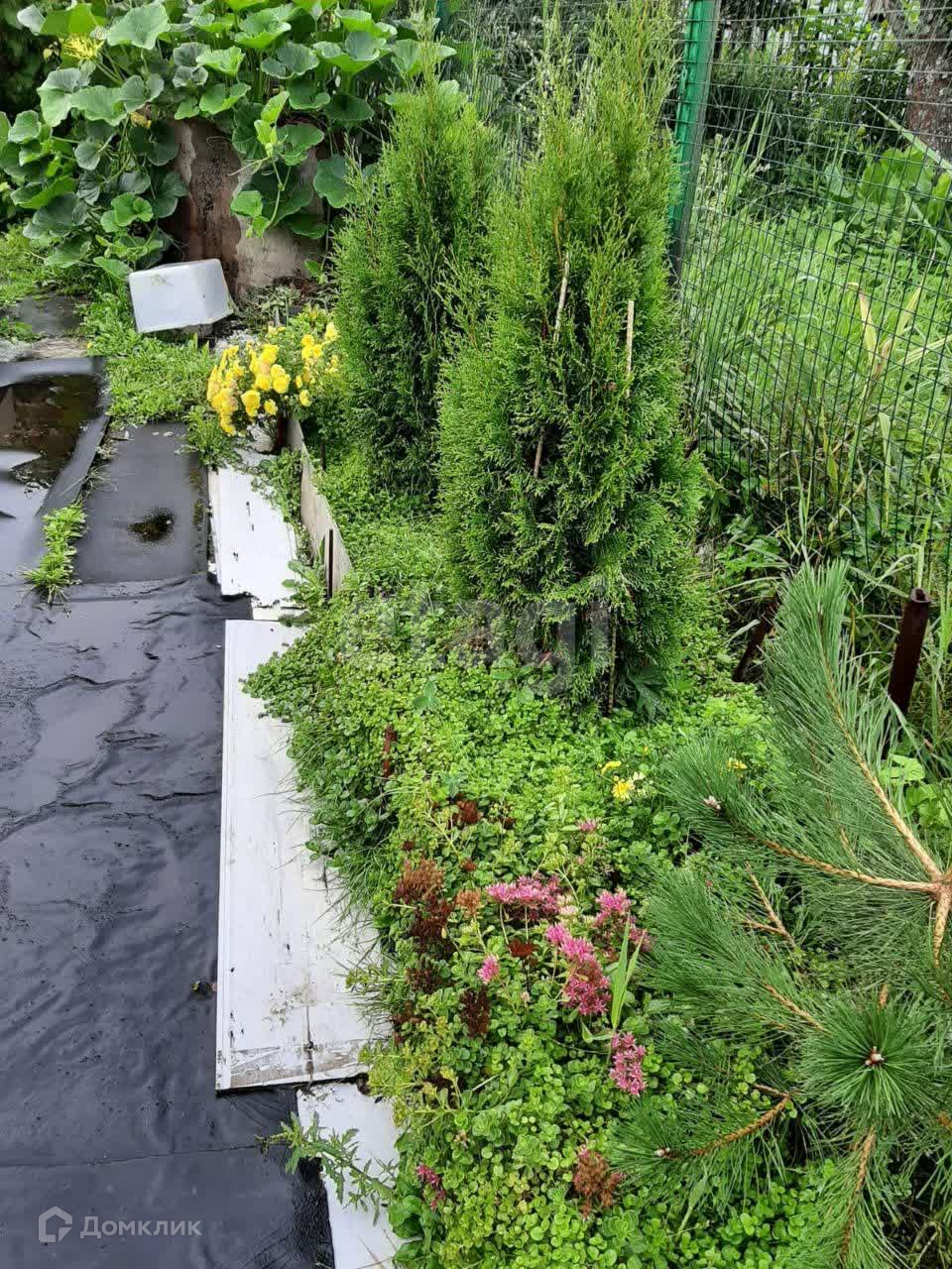 На участке растут плодовые деревья, 5 яблонь, две сливы, много кустов чёрной смородины, малины, 3 дерева калины, 3 туи, садовая сосна. Также есть грядка клубники, много цветов, среди них лилии,флоксы и пионы разных расцветок лилейники, ромашки, розы. На садовых дорожках лежит технониколь. Борта грядок из асбоцементных полос.