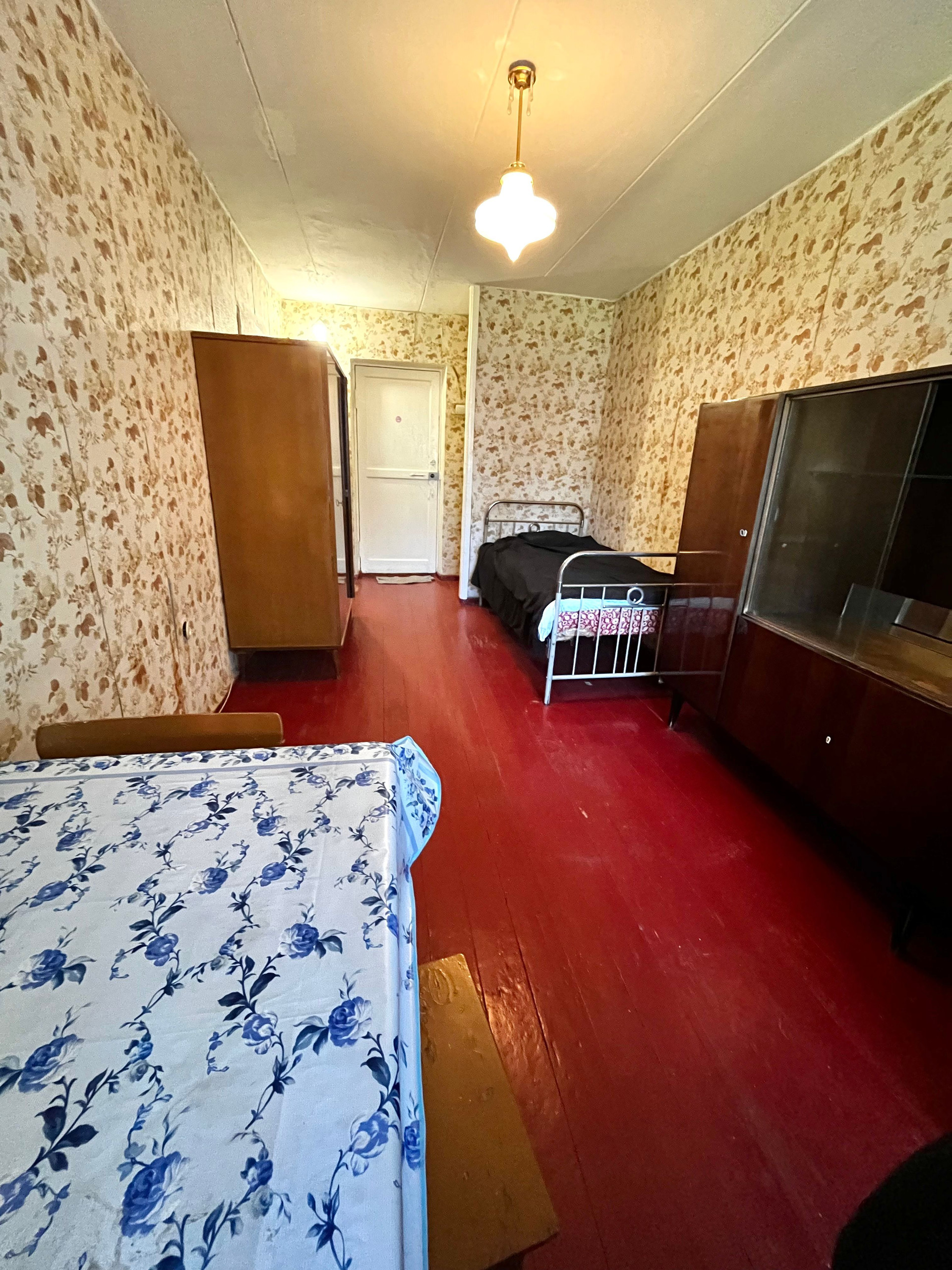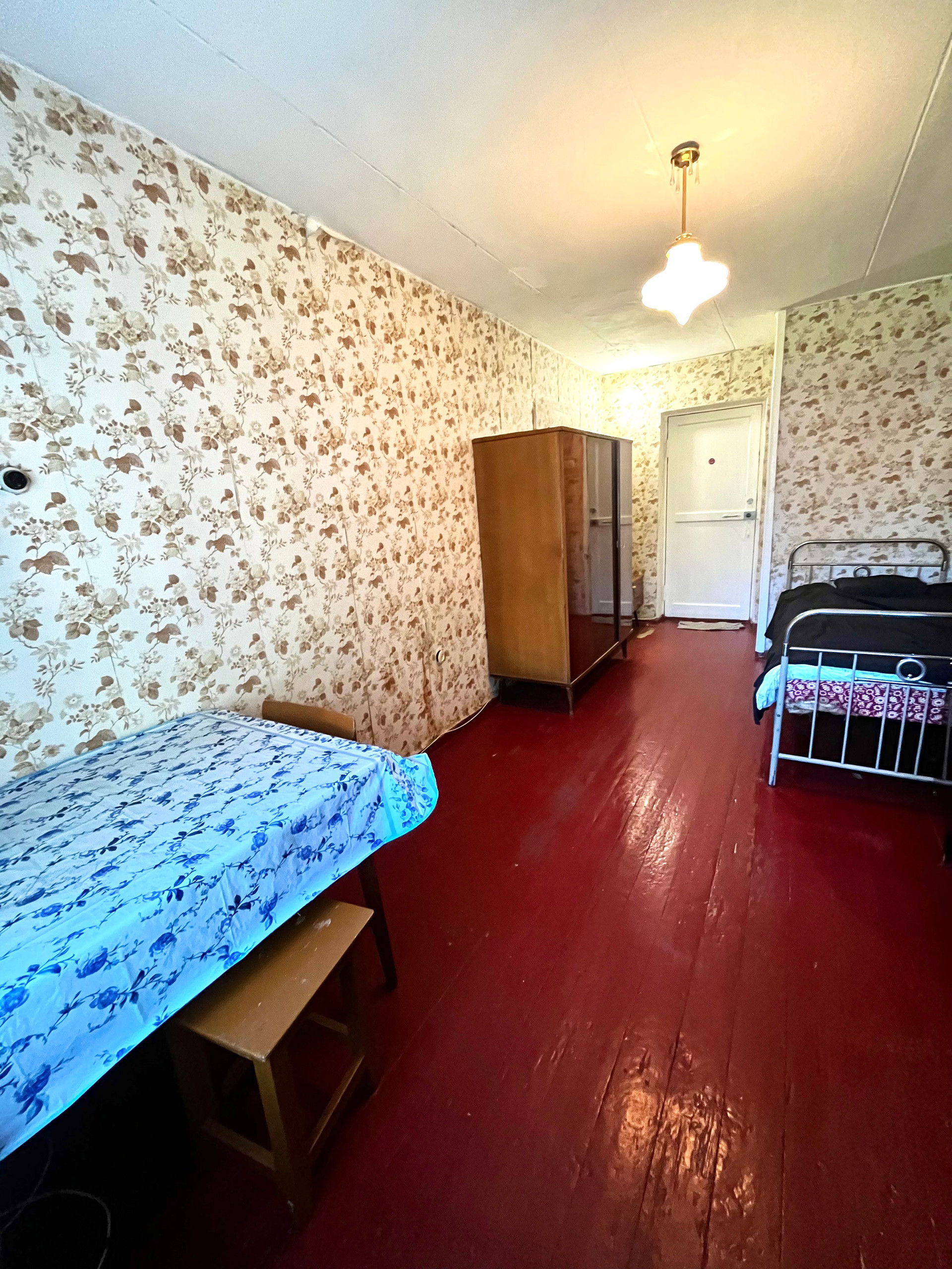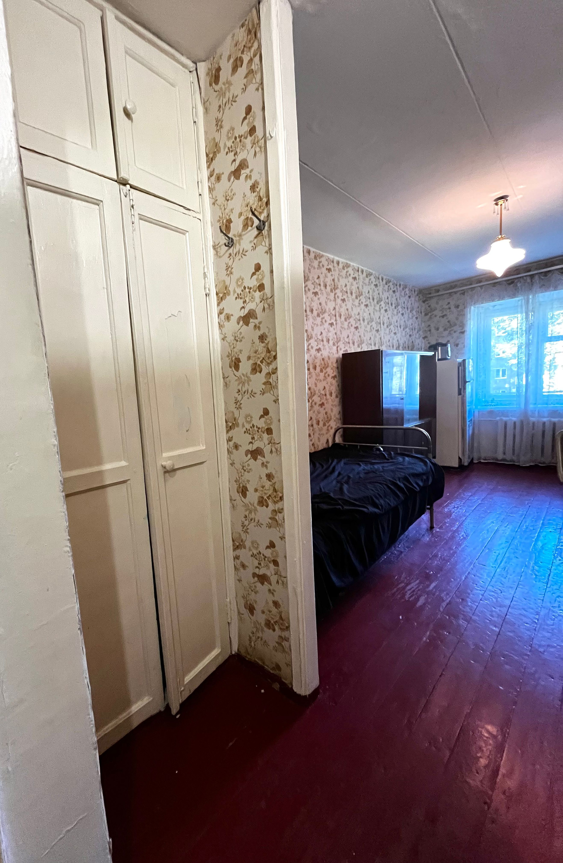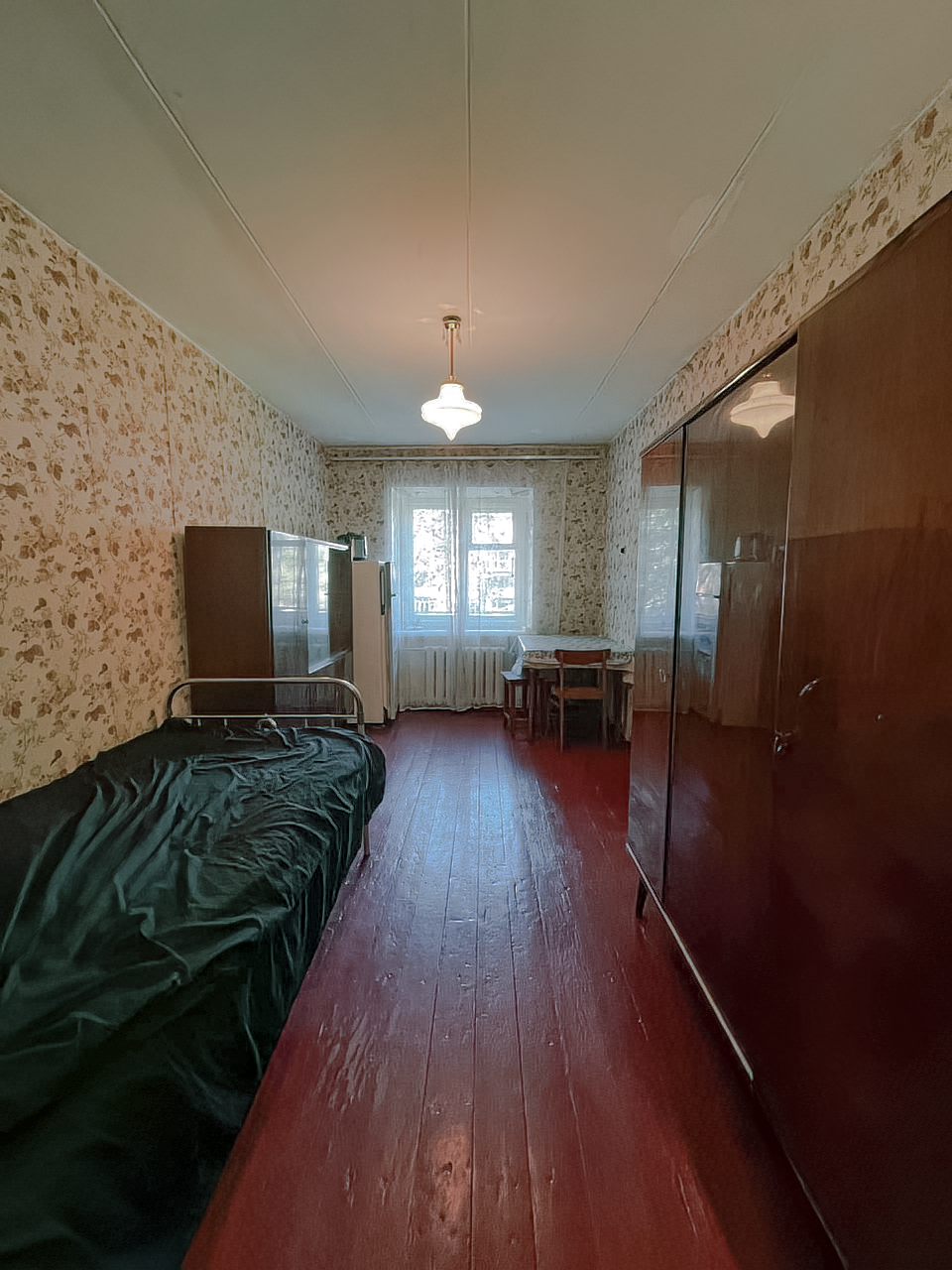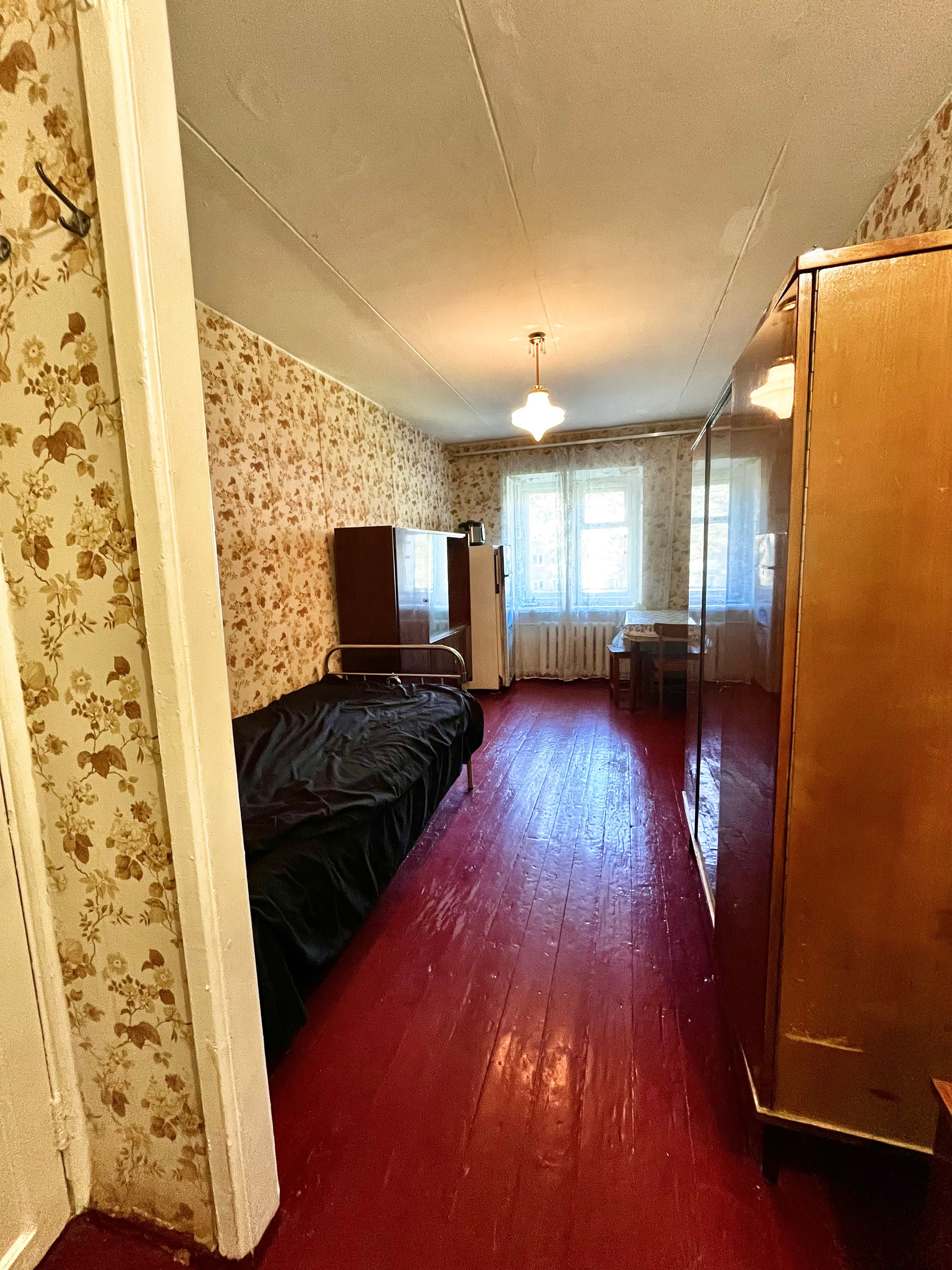 В комнате есть место для гардероба, остаются кровать, холодильник, стол и два шкафа