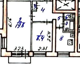 2-х комнатная квартира 44,4 м2 в кирпичном четырёхэтажном доме с центральным отоплением. Четыре собственника. Квартира в середине дома, 2-й подъезд. Описание: - В квартире есть кухонный гарнитур, шкаф, стиральная машина. - Кухня по плану 5,7 м2. Совмещена с комнатой. Перепланировка узаконена. - Санузел совмещённый. - Счетчики все поменяны. - Высот... |