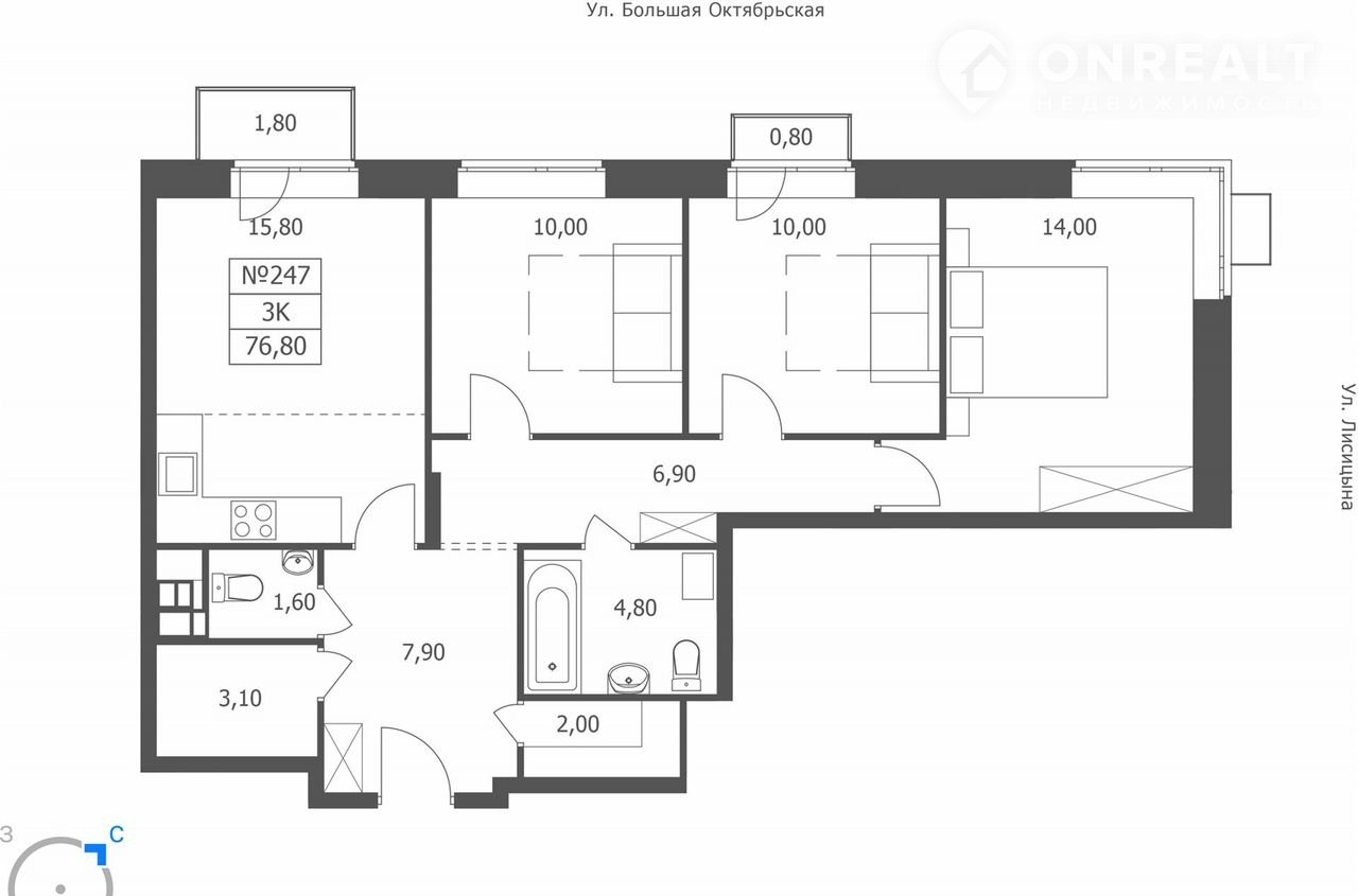 3-комнатная квартира, 76.8 м2, этаж 9 / 11, на продажу в Ярославле, Большая Октябрьская улица, 85