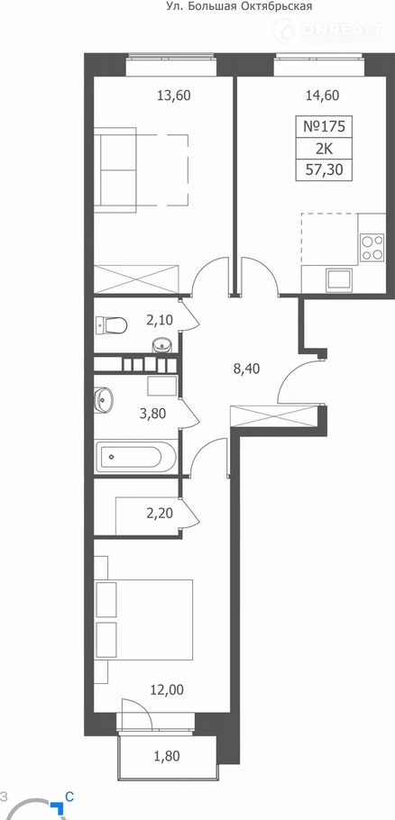 2-комнатная квартира, 57.3 м2, этаж 9 / 11, на продажу в Ярославле, Большая Октябрьская улица, 85
