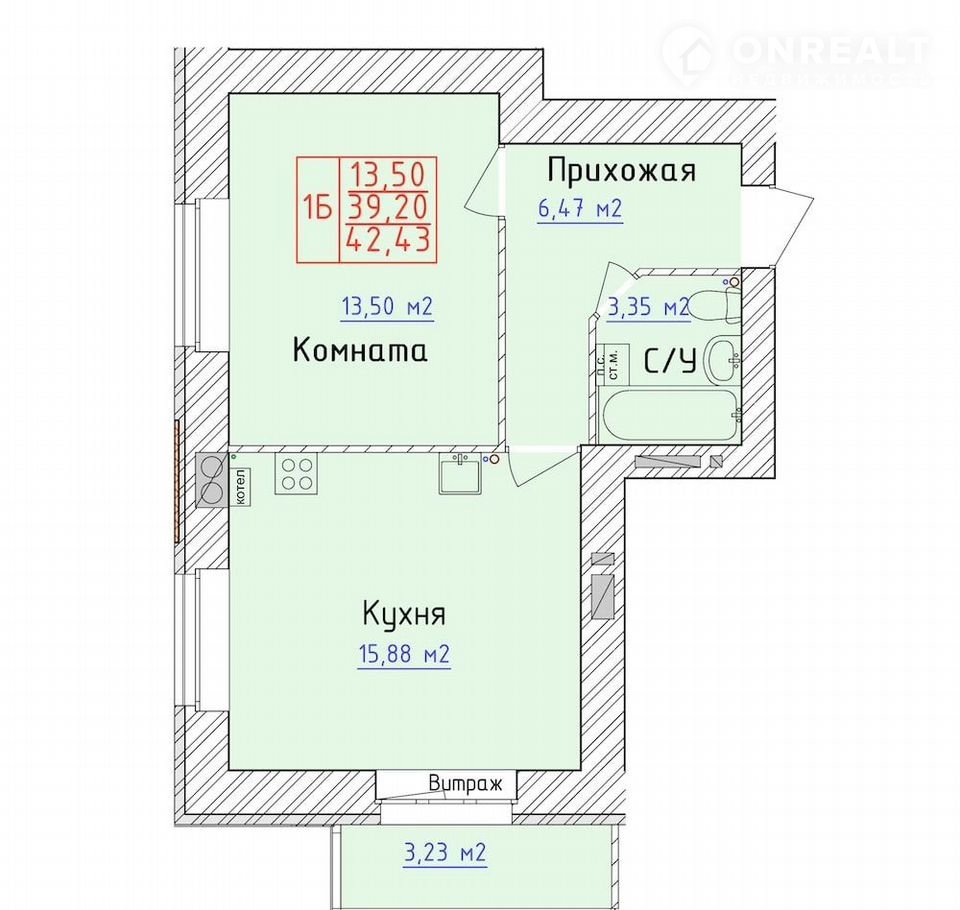 Общая площадь 42.4 м2