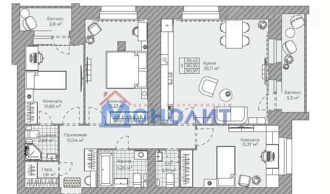 Площадь кухни 26 м2