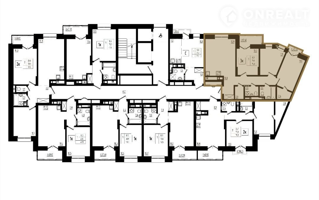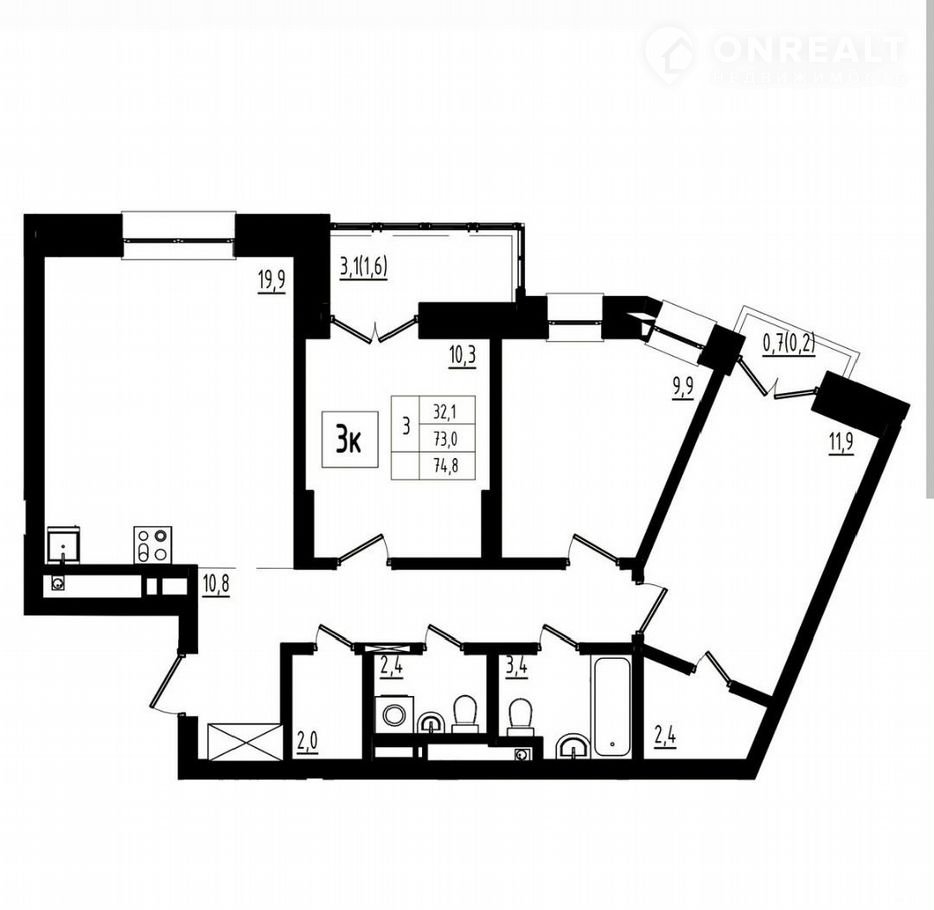 Общая площадь 74.8 кв.м. Просторная и светлая кухня - 19.9 кв.м., 3 комнаты  11.9 кв.м.; 10,3 кв..м; 9.9 кв.м., так же 2 совместных санузла. Также в квартире присутствует большая и полностью застеленная лоджия 3,1кв.м и французский балкон  0.7 кв. м.