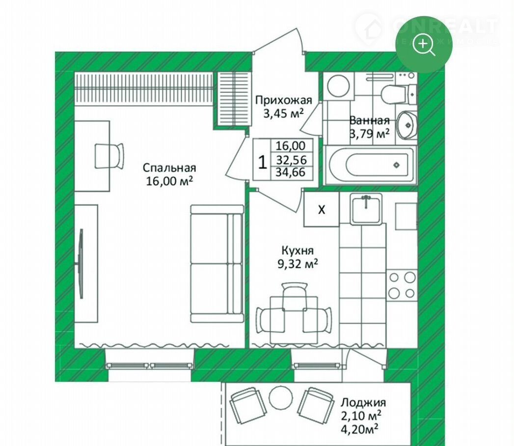 Общая площадь 34.7 м2