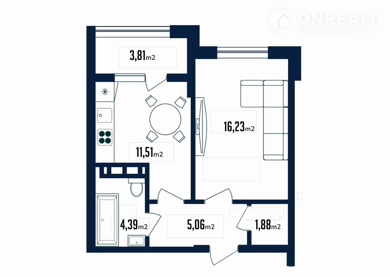 Общая площадь 42.9 м2