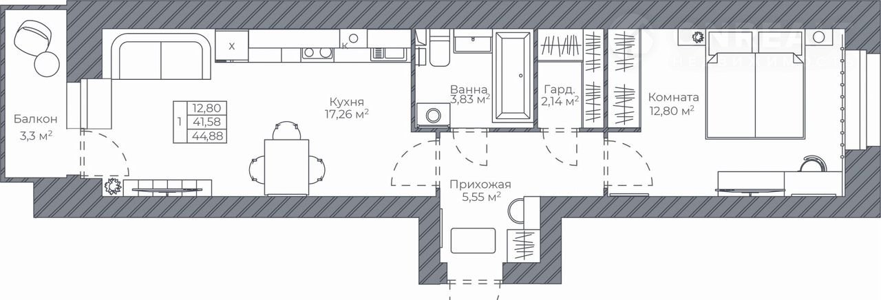 Общая площадь 44.9 м2