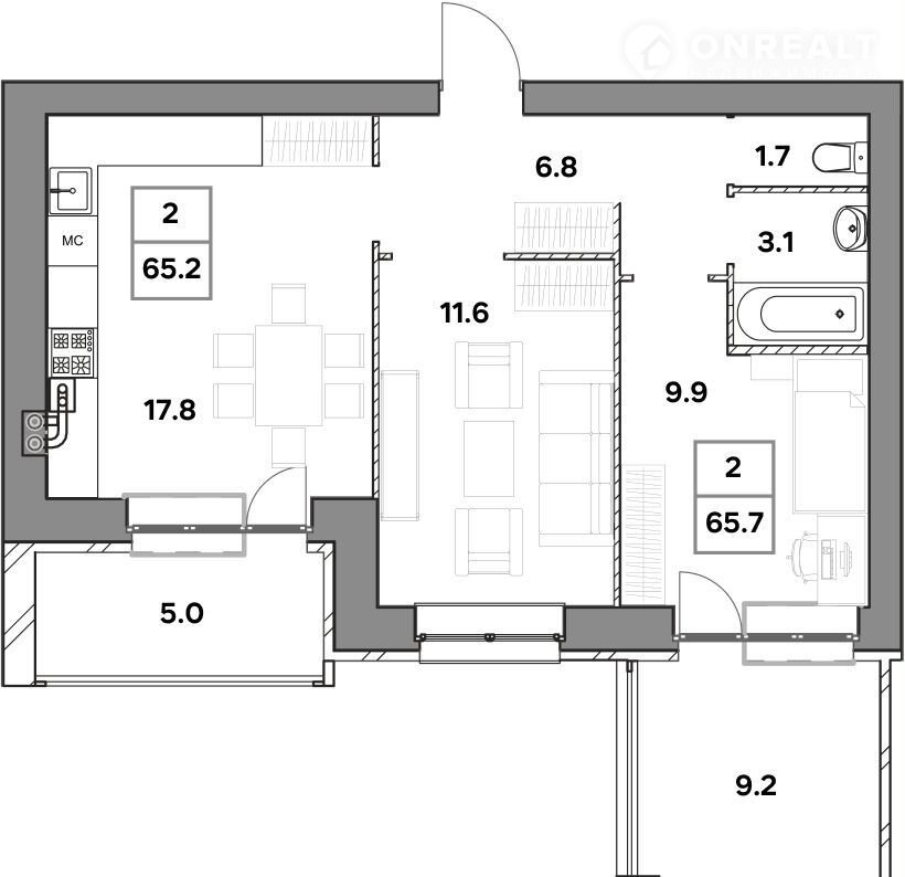 Общая площадь 65.2 м2