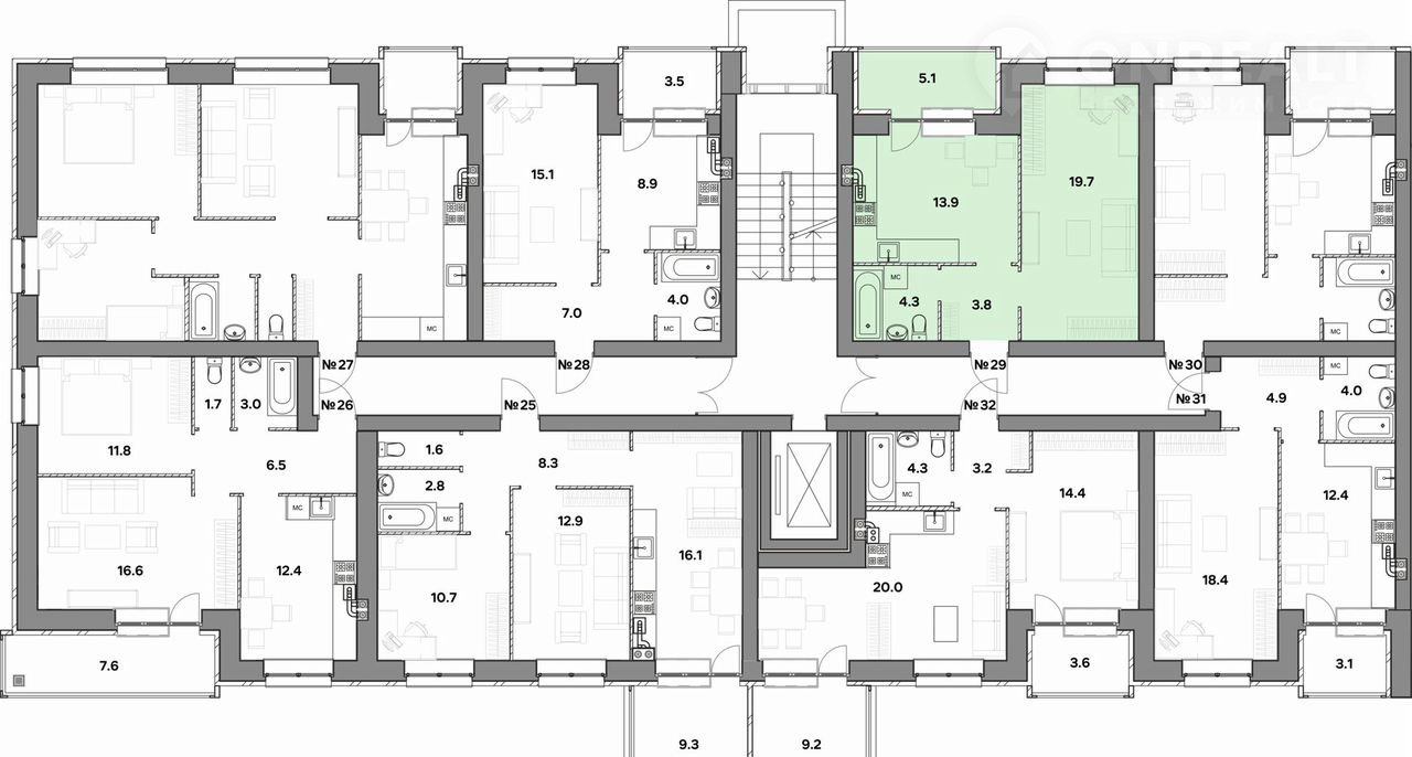 Жилая площадь 19.7 м2