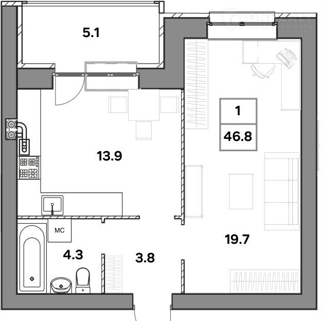 Общая площадь 46.8 м2