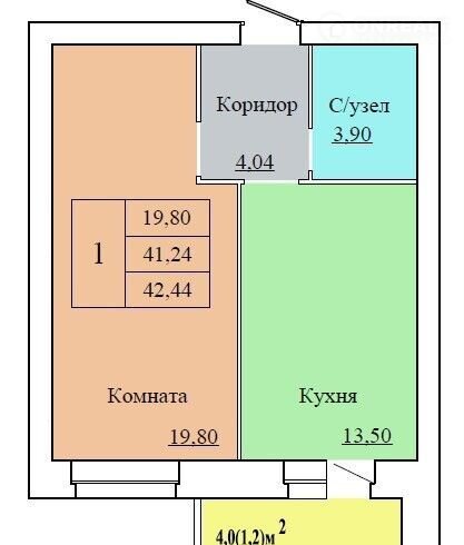 Общая площадь 42.4 м2