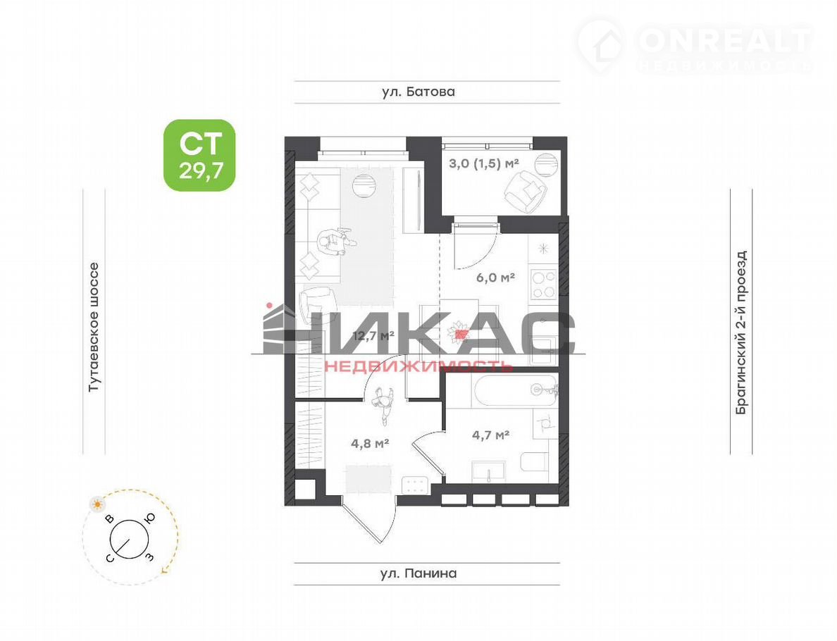 Общая площадь 29.5 м2