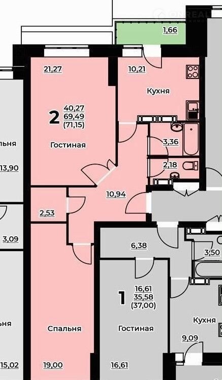 Жилая площадь 40.3 м2