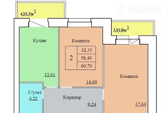 Общая площадь 60.7 м2