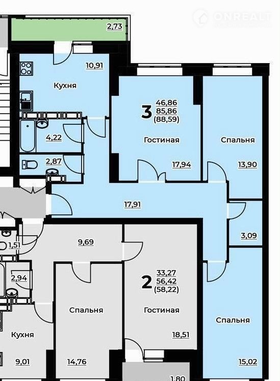 Общая площадь 88.6 м2