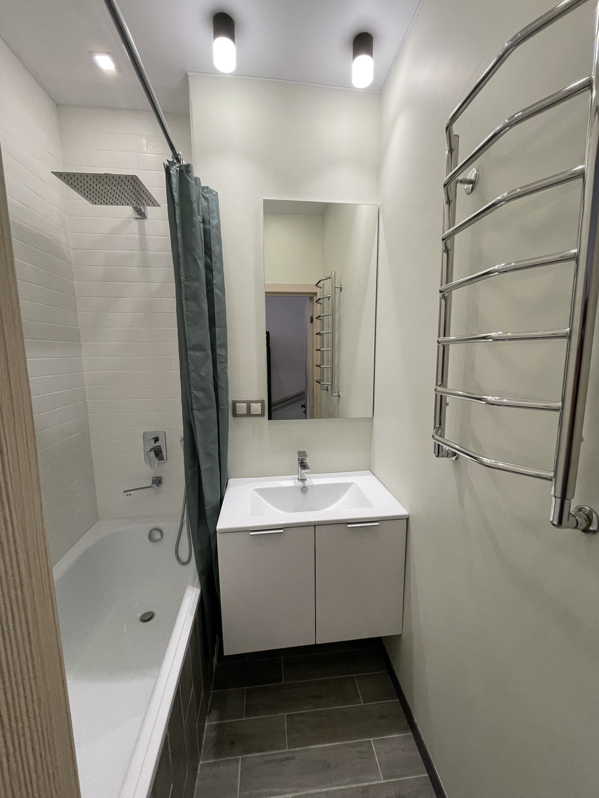 От дельная ванна со скрытой сантехникой, тропический душ, встроенный шкаф с зеркалом, теплый пол;
