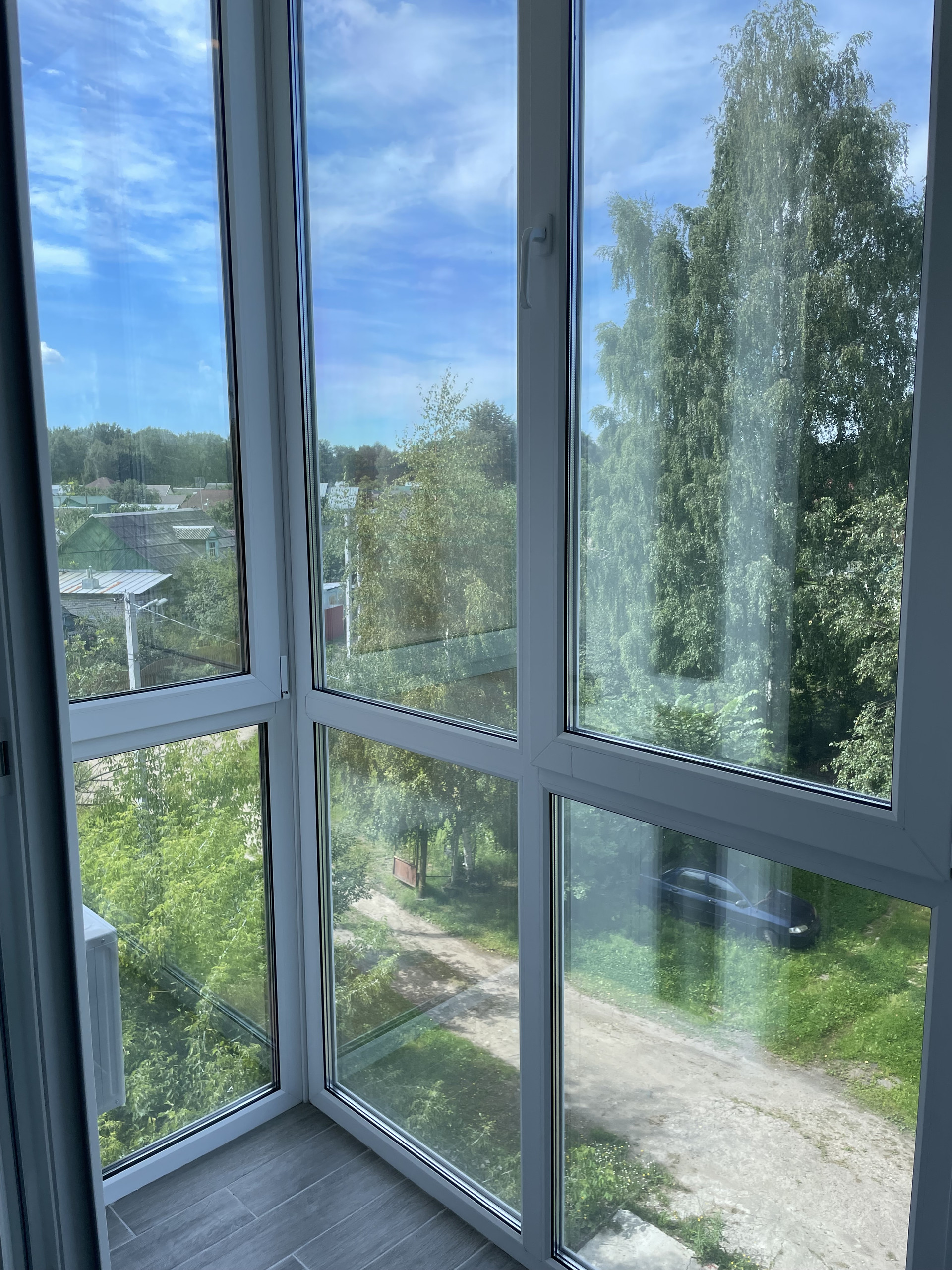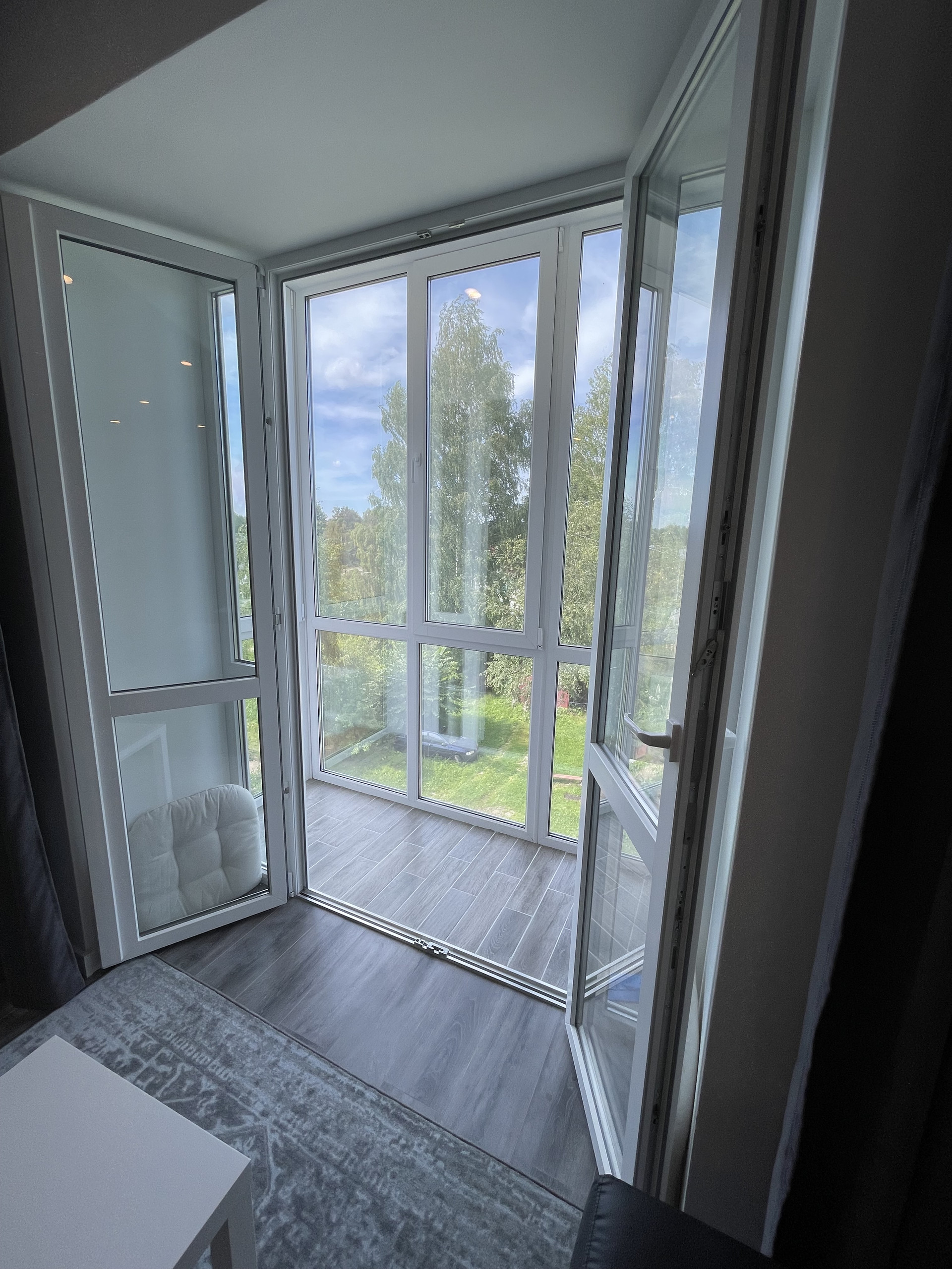 Балкон с панорамным остеклением, отоплением и регулятором теплого водяного пола, встроенный стеллаж.