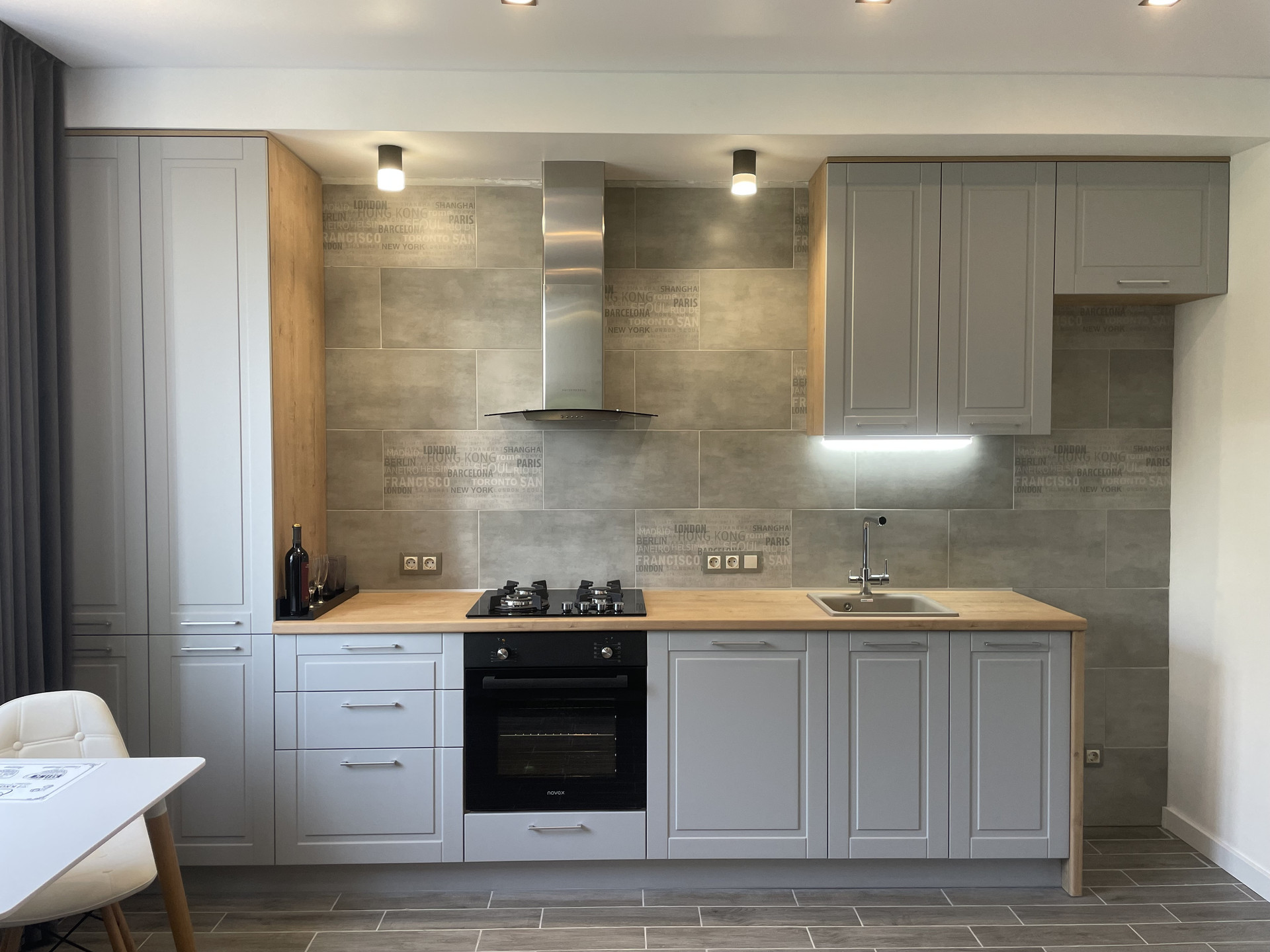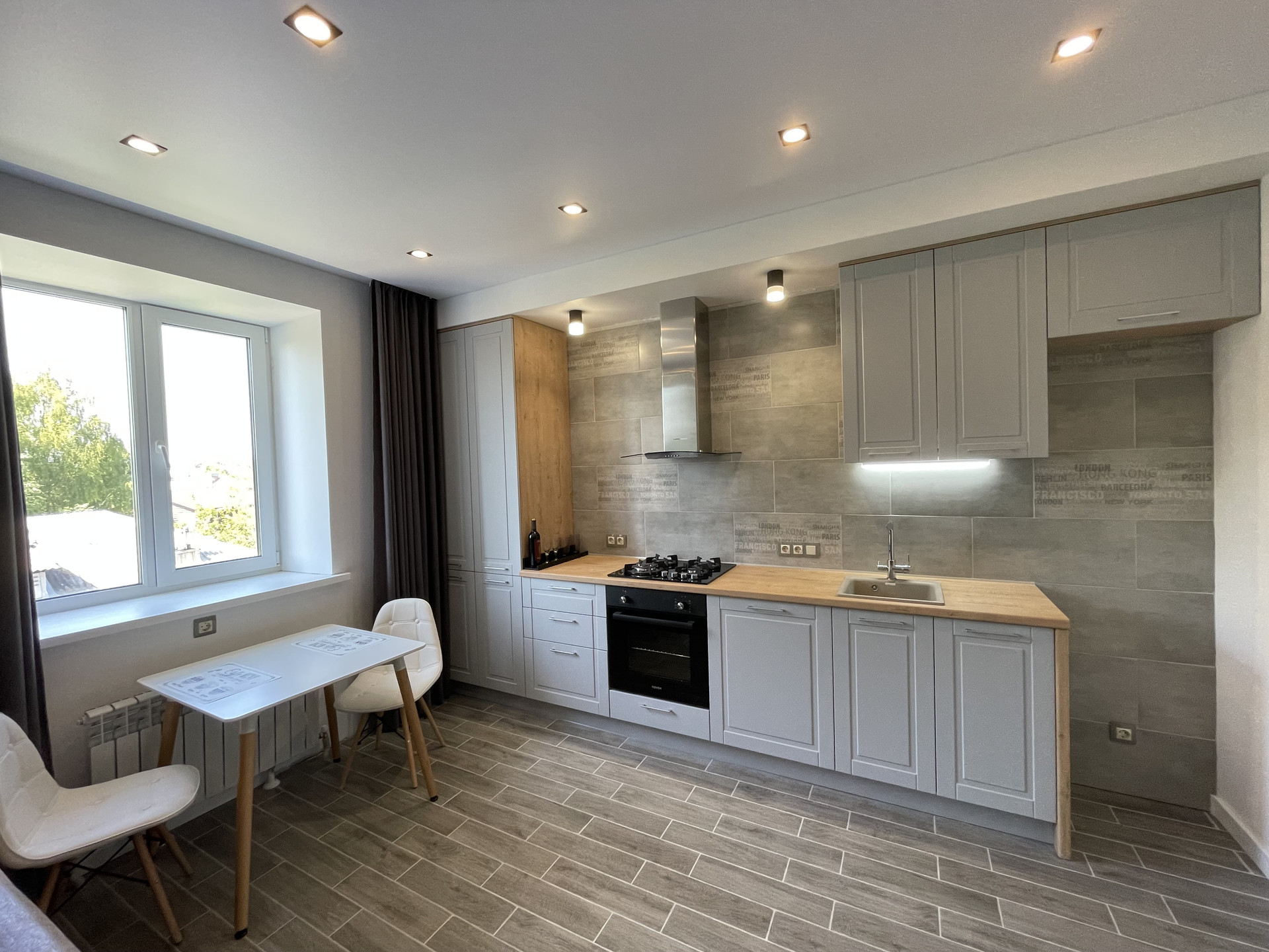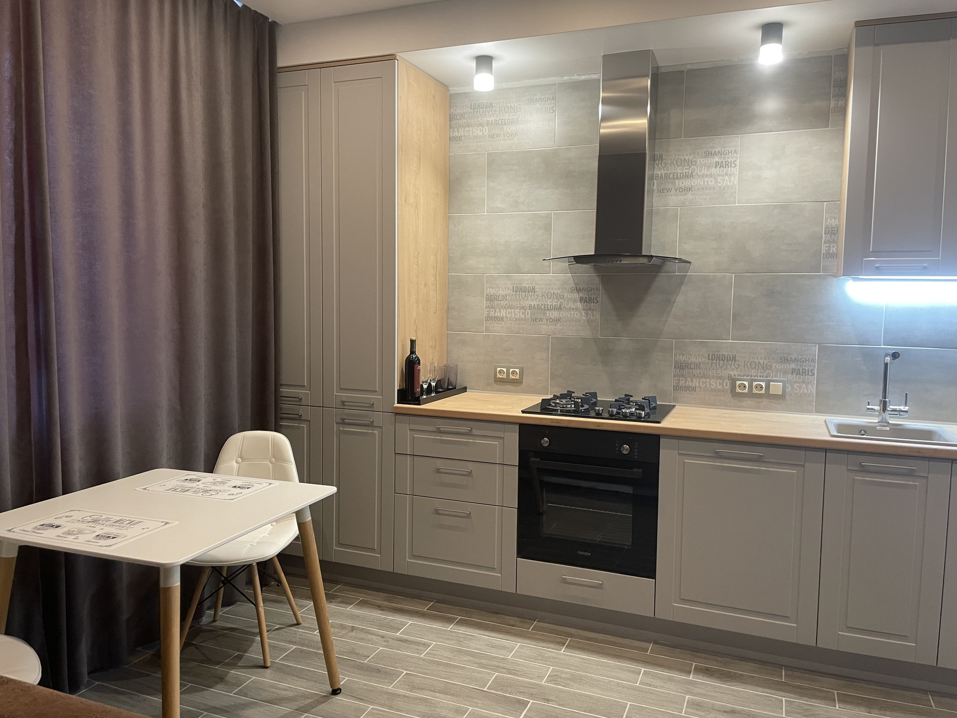 Встроенный кухонный гарнитур с подготовкой для установки посудомоечной машины, электродуховкой, немецкая вытяжка каминного типа, варочная панель из закаленного стекла с электроподжигом и газконтролем, фильтр питьевой воды под раковиной, теплый пол;