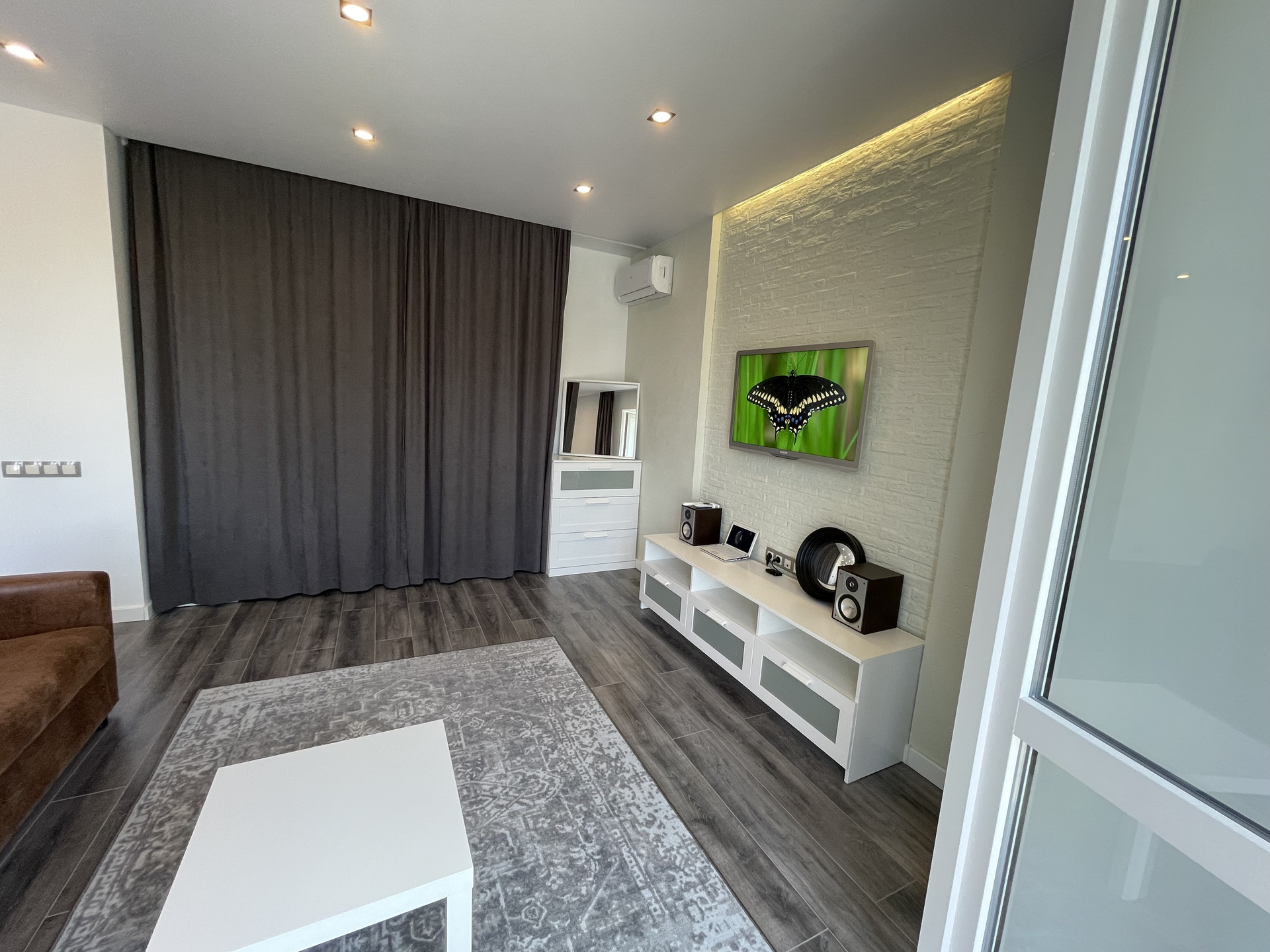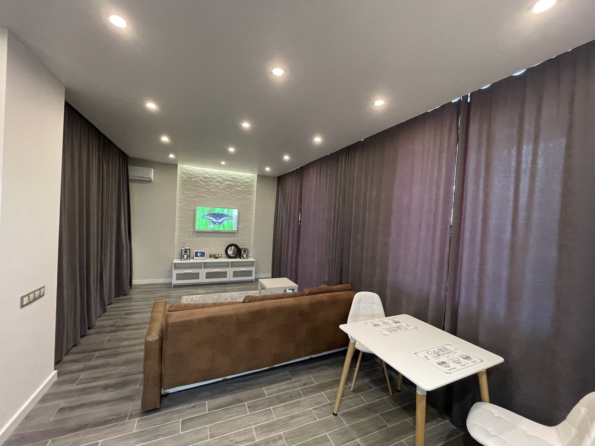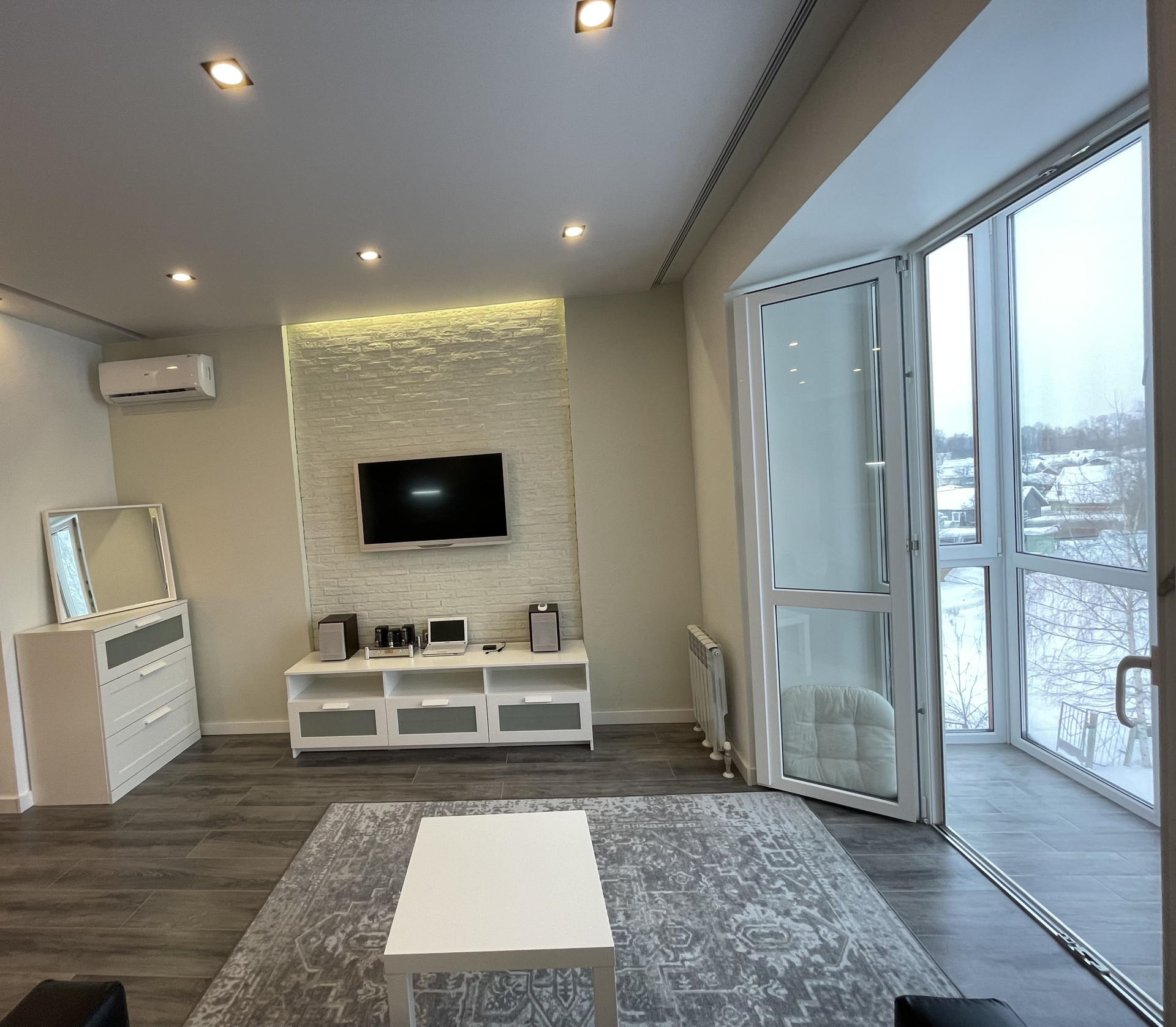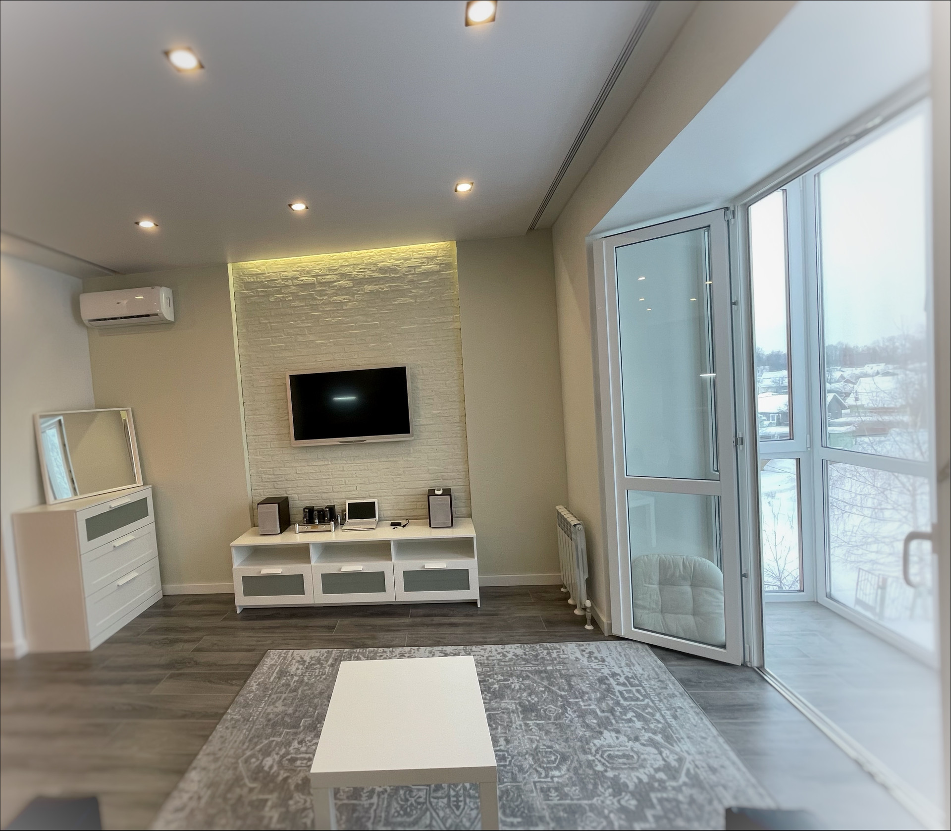 Гостиная с раскладным двуспальным диваном, тумба под TV в нише с атмосферной подсветкой скрытая проводка для аудио и видео системы.