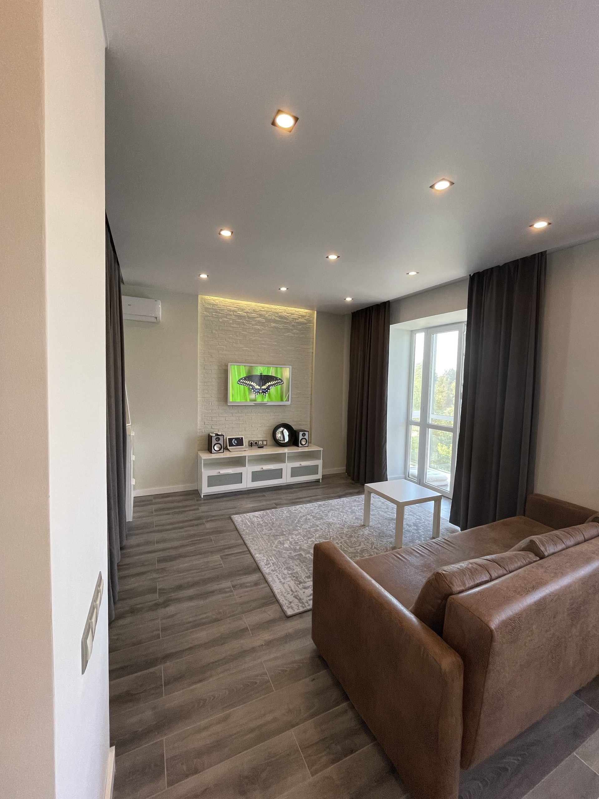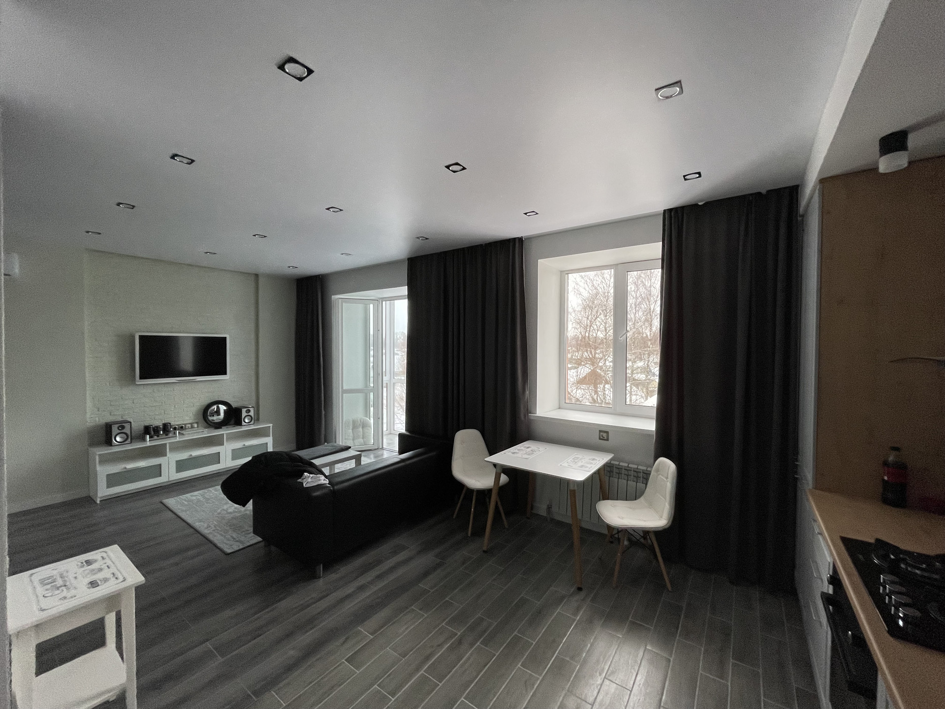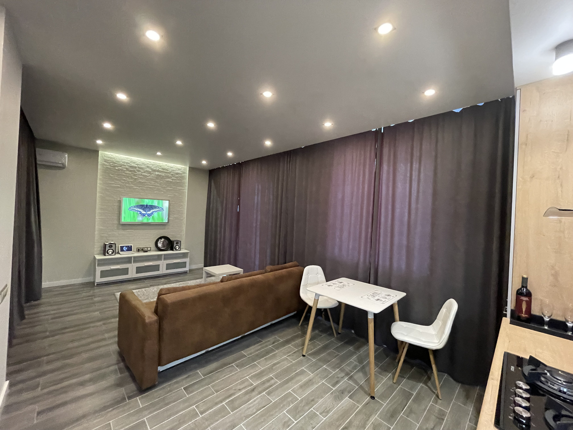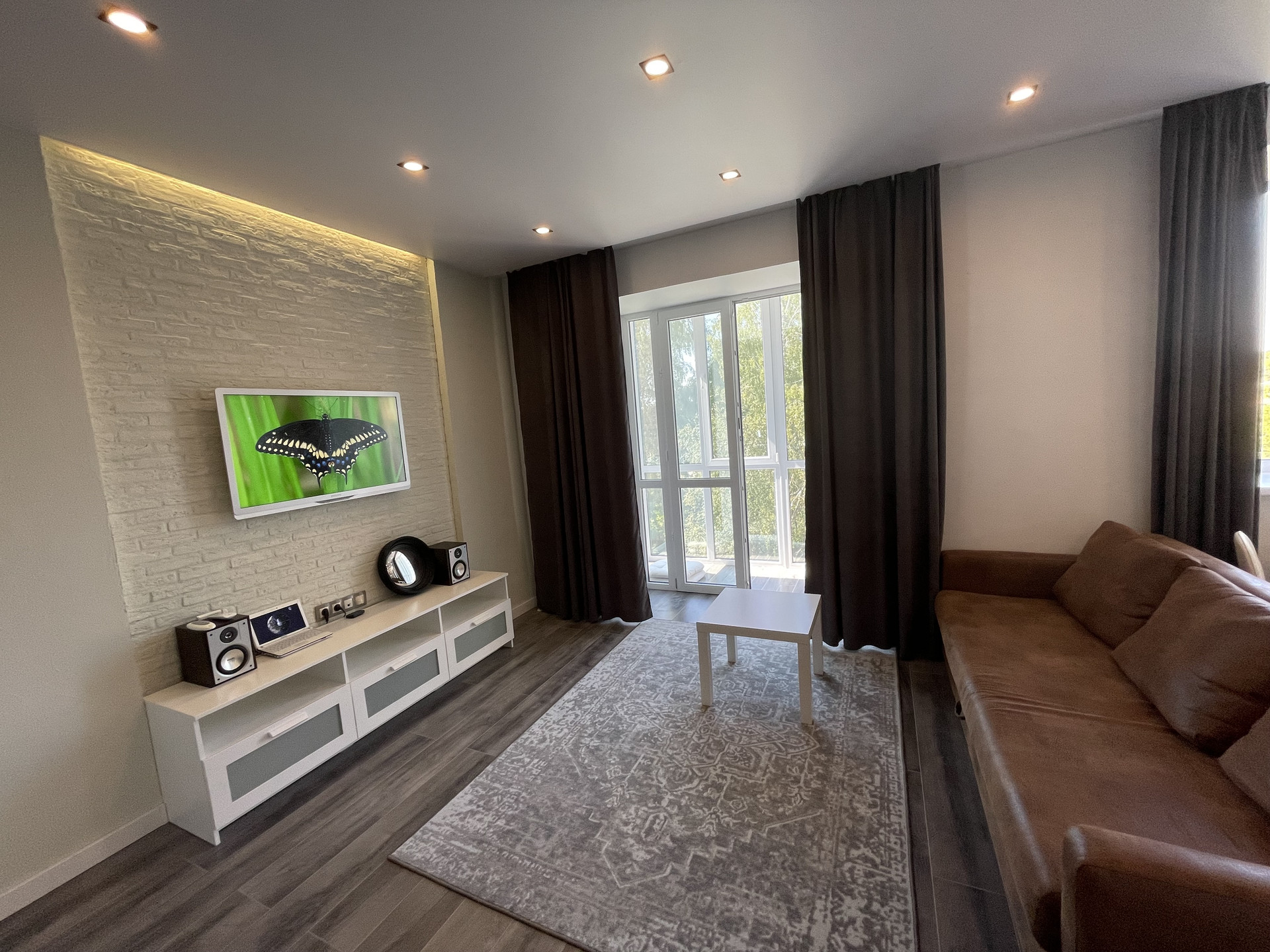 Гостиная с раскладным двуспальным диваном, тумба под TV в нише с атмосферной подсветкой скрытая проводка для аудио и видео системы.