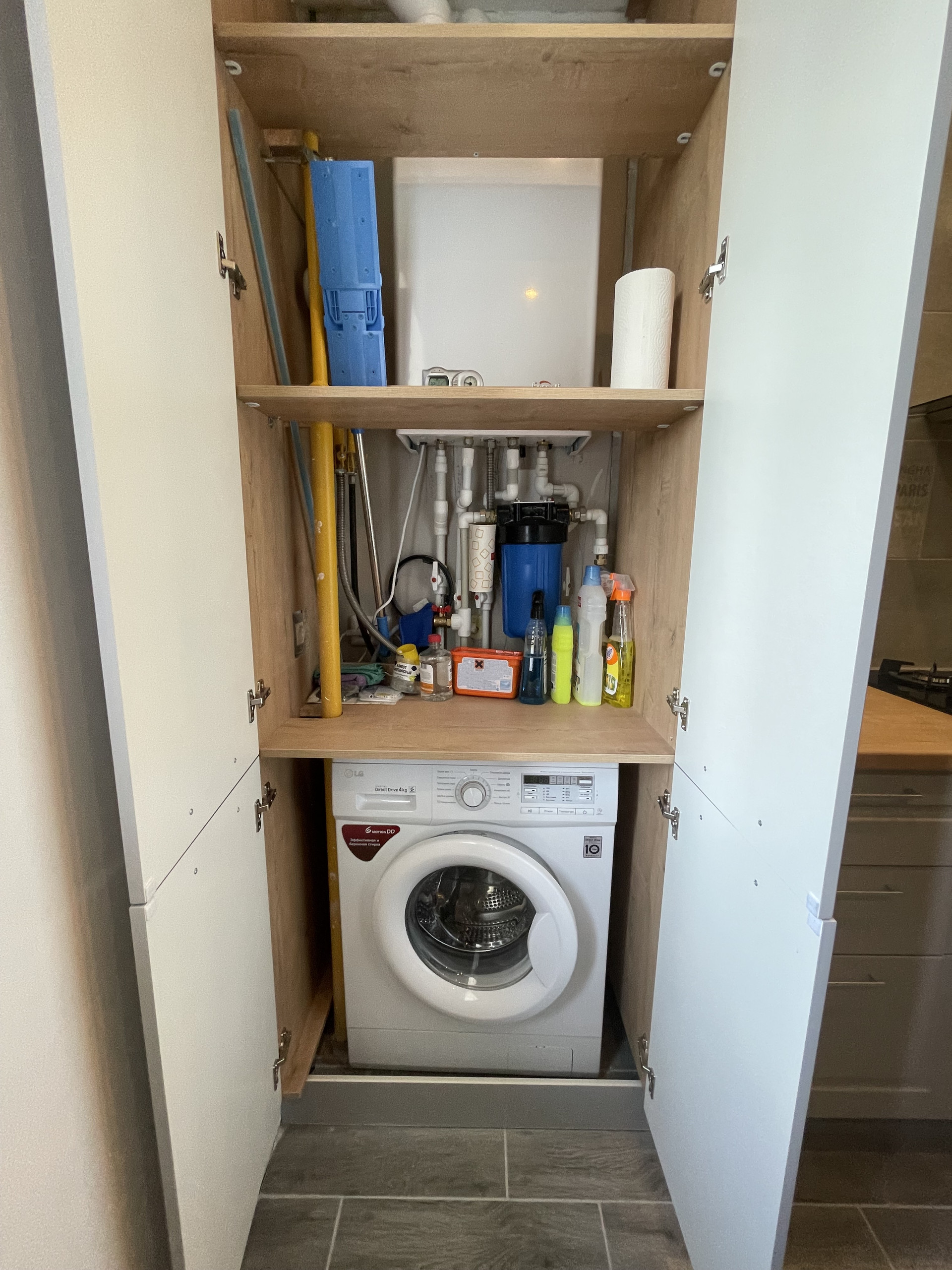 Постирочная с газовым котлом отопления и подогрева воды и установленной стиральной машиной.