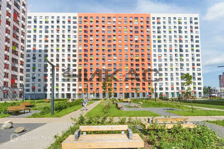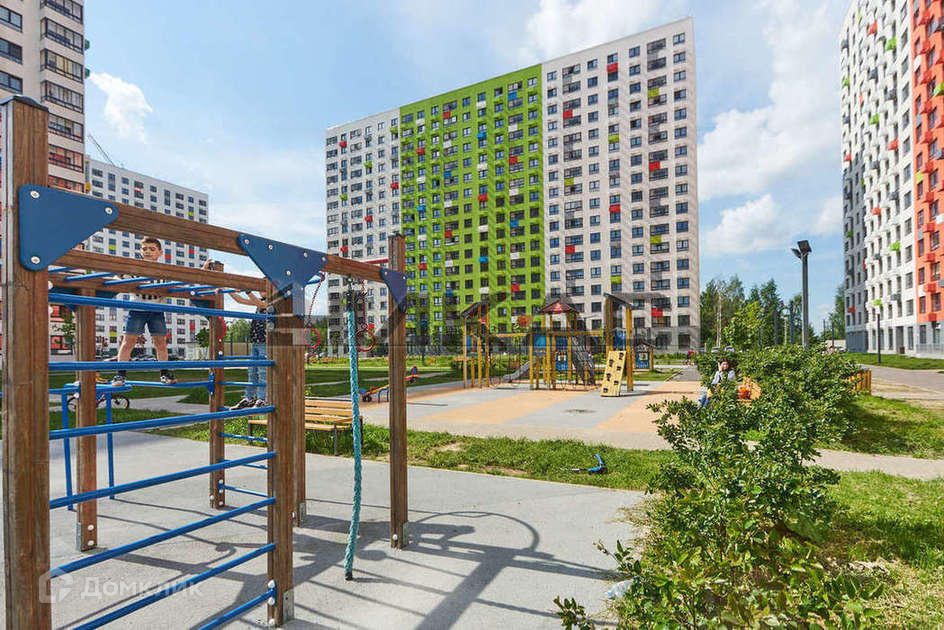 Двор без машин. На территории двора установлены детские и спортивные площадки, а также предусмотрена просторная зеленая зона.