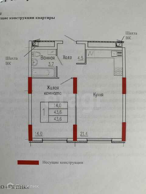 Общая площадь 43.6 м2