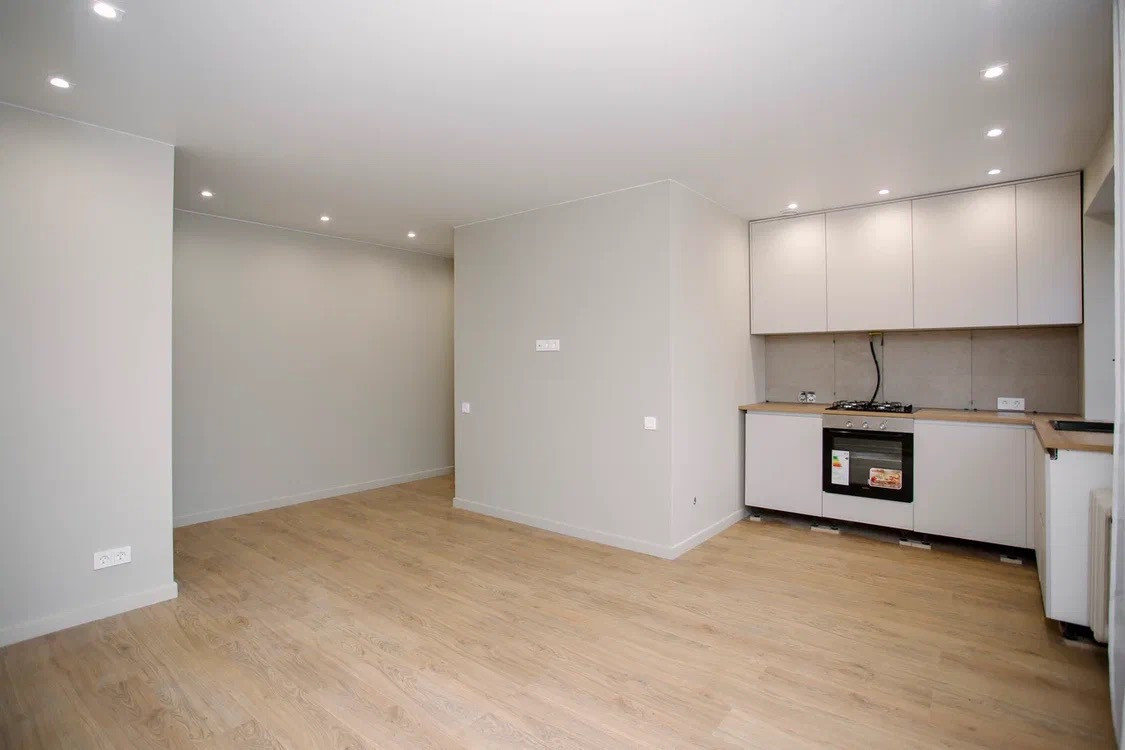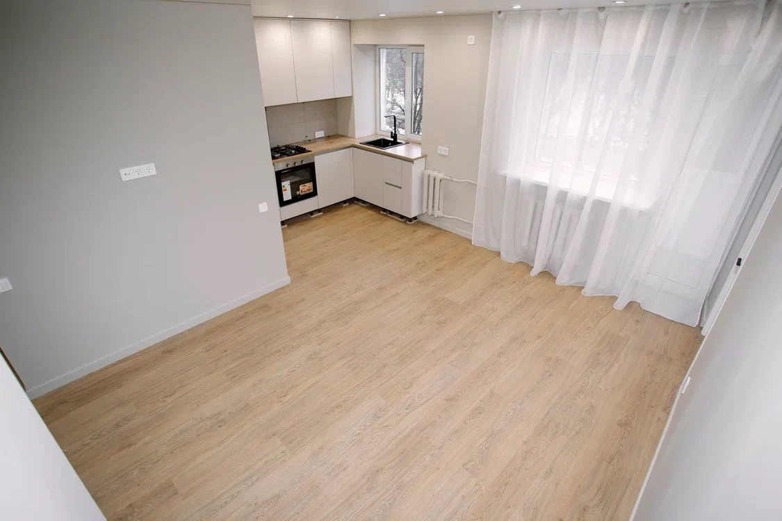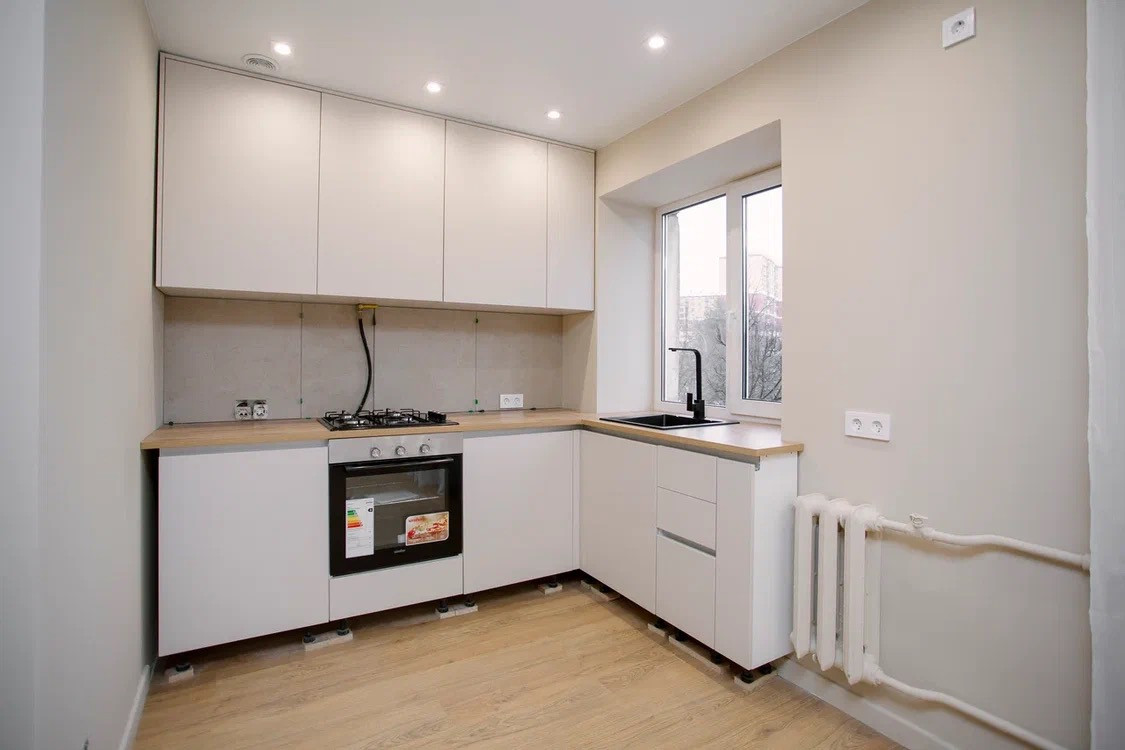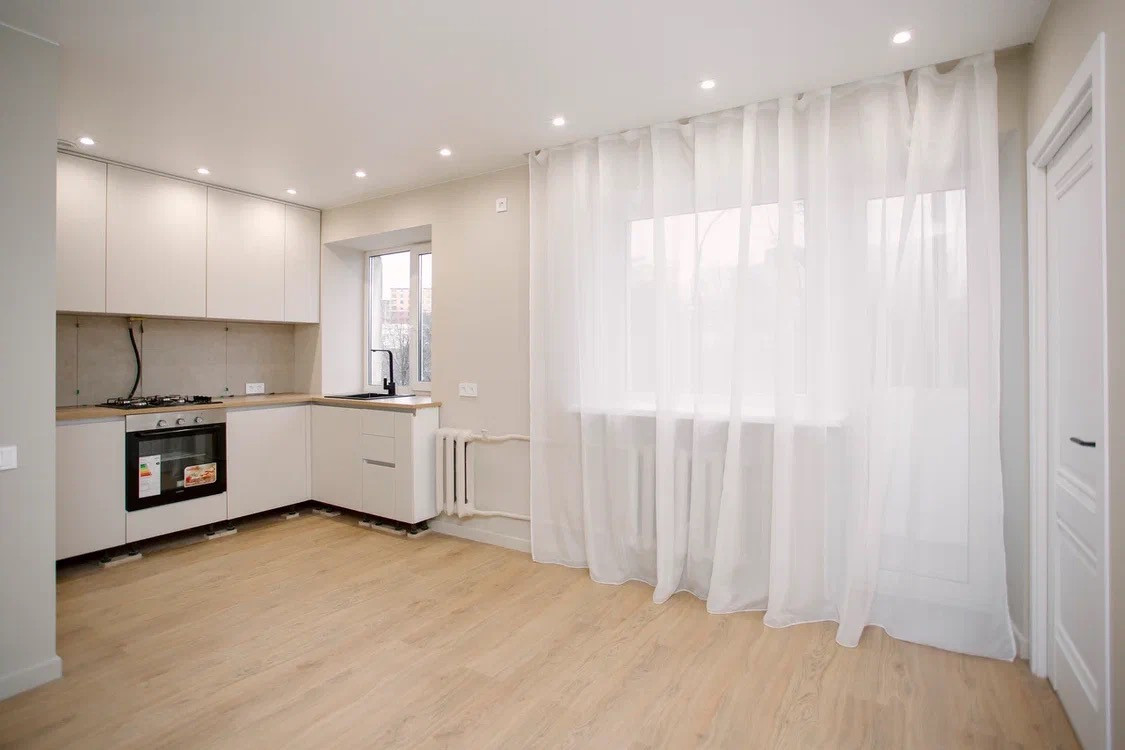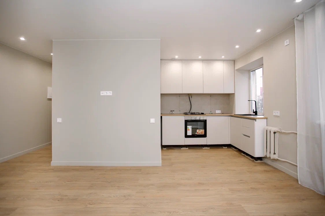 - Установлен кухонный гарнитур с варочной поверхностью и духовым шкафом.