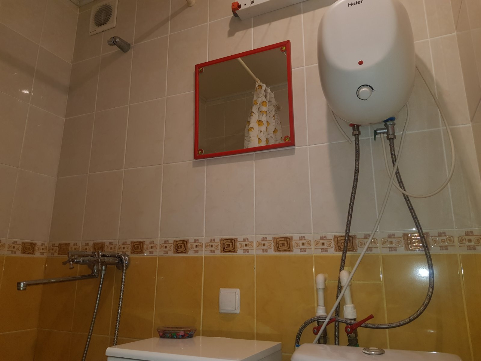 - Санузел совмещенный в плитке. Остается водонагреватель. Трубы все заменены на ПВХ, установлены счетчики.